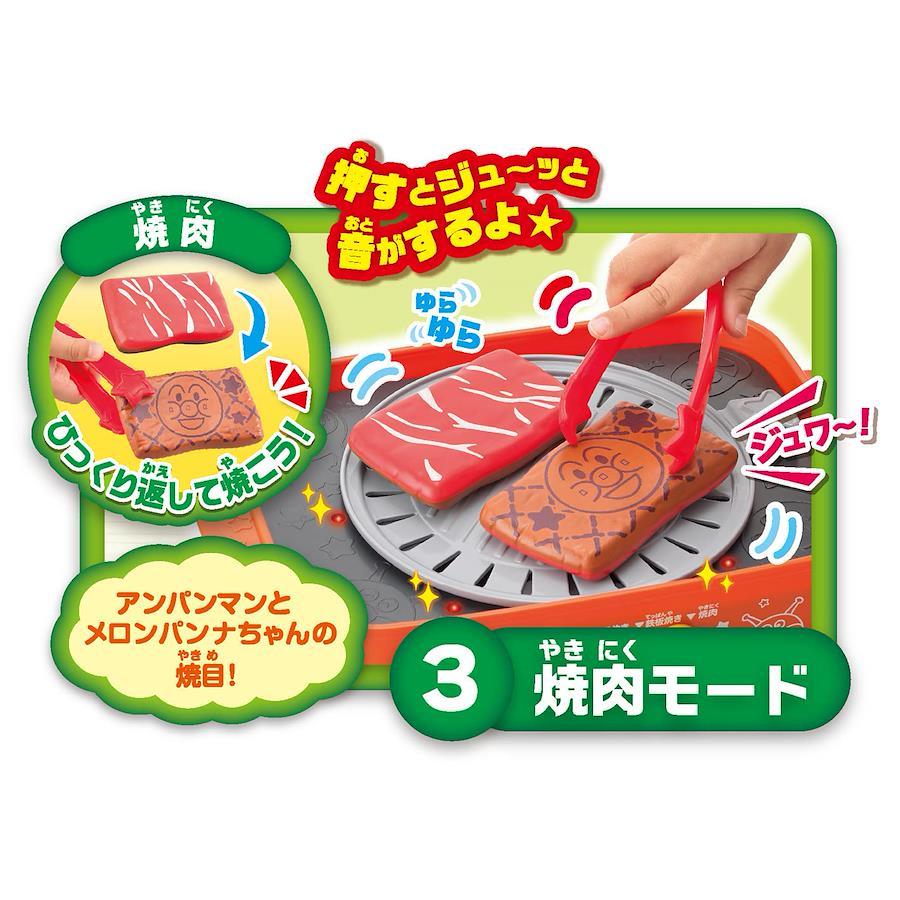 焼肉モードはお肉をのせてトングで押すと「ジュワ~!」、お肉はひっくり返すとアンパンマンとメロンパンナちゃんの焼き目に変わるよ!