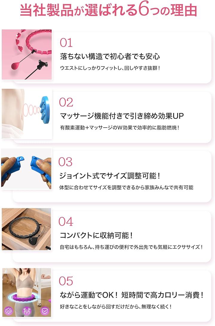 従来のフラフープよりも効率よく脂肪を燃焼し、引き締まったボディを目指せます。