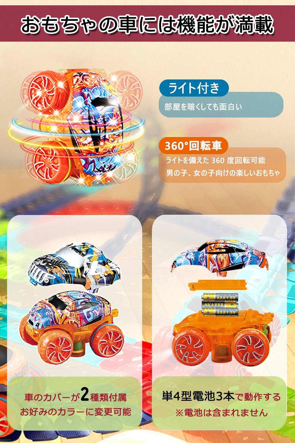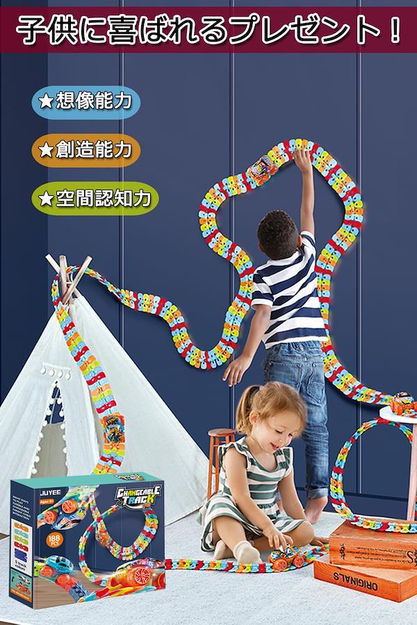 【レールの上を走る車おもちゃ】車はレールの上を走ることができ、レールは曲げたり、スナップしたりして、さまざまな形に変形することができます。屋内はもちろん、屋外スペースをDIYのトラックコースに変え、そびえ立つトラックや360°ループを構築して車を走らせて遊べます。【知育玩具】お子様は遊びの中でコミュニケーション能力や思考能力、空間認知能力などを育むことができます。ぜひ親御様もご一緒に遊んであげてください♪お子さまだけでなく、大人も夢中になってしまうエキサイティングなおもちゃ。想像力、思考力、発想力を育み、また指先を使うおもちゃはプレゼントにも最適です【様々なカスタム方法】車はスイッチをON/OFFにすることで自動で走行したり手動で走行させたりすることができます。専用の車はレール中央にある凸型の部分に噛み付いて進むのでレールを90度直角の壁にくっつけても、逆さまにしても落っこちません!また、車のカバーが2種類付属しているのでお好みのカラーに変更可能です♪【プレゼントとして最適】お誕生日、初節句、クリスマス、入園のお祝いなど、ご両親からお子様へのプレゼントとして最適!ご友人やお知り合いなど大切な方へのお祝い事のプレゼントとしても大変喜ばれますよ♪【壊れにくい素材】ABS樹脂素材で、衝撃に強く壊れにくい!ミニカーを自動で動かすには単4電池が3本必要です。(この商品には付属しておりません。)