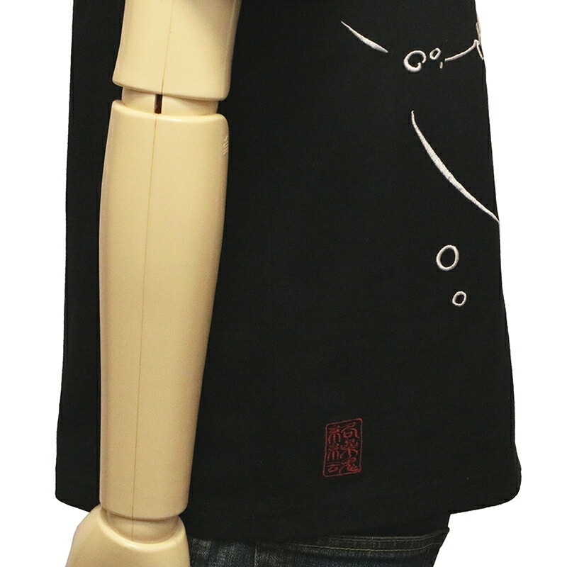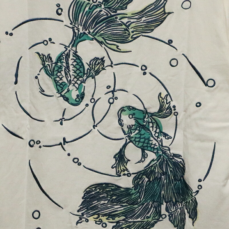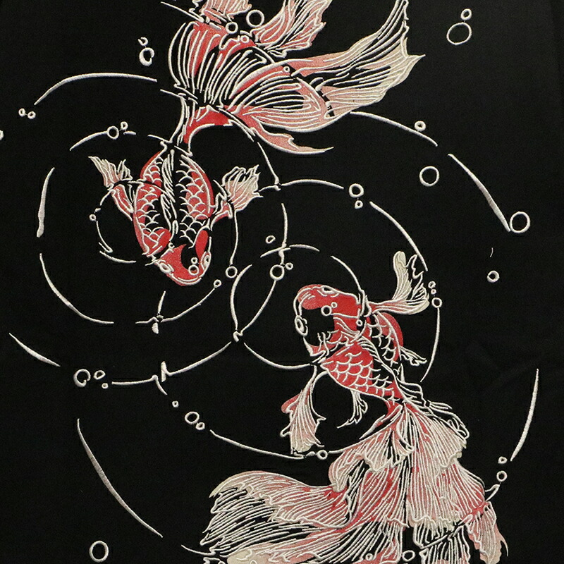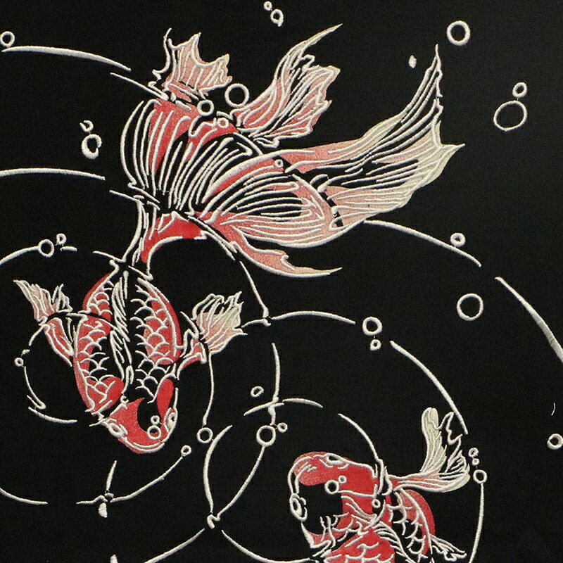 フロントは左肩から左胸にかけ背面に同様に2匹の金魚と波紋を刺繍で配置。