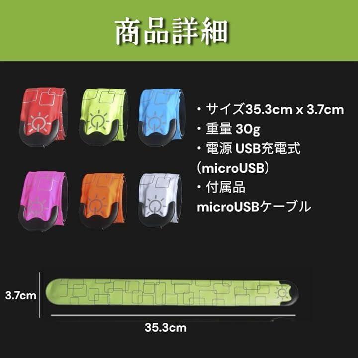 ・50m離れた場所からもしっかりと認識できる明るさ。 ・撥水性急に雨が降っても安心 ・約30gととっても軽量 ・夜間のランニングやサイクリング、ペットのお散歩など様々なシーンで大活躍。 「詳細」 サイズ:全長35.3cmx幅3.7cm 重量:約30g 材質:ナイロン、マンガン銅 充電方法:micro USB(Type-CまたはType-B) 充電時間:約30分 カラー:全6色 (レッド、イエロー、ブルー、ピンク、オレンジ、ホワイト) *イエローは発光時グリーンに変わります。