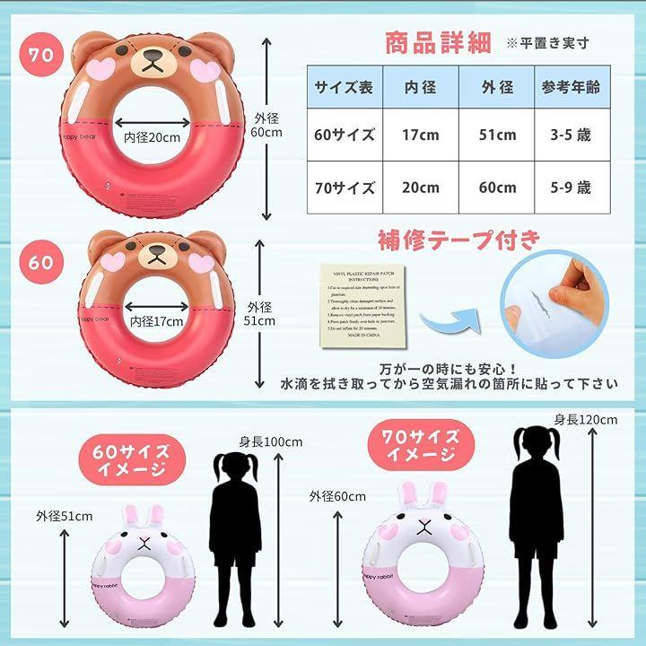 「サイズ詳細」60size 使用年齢目安:3歳から5歳前後 実寸:直径51cm/内直径17cm 70size 使用年齢目安:5歳から9歳前後 実寸:直径60cm/内直径20cm *空気注入前の平置き実寸表記となります