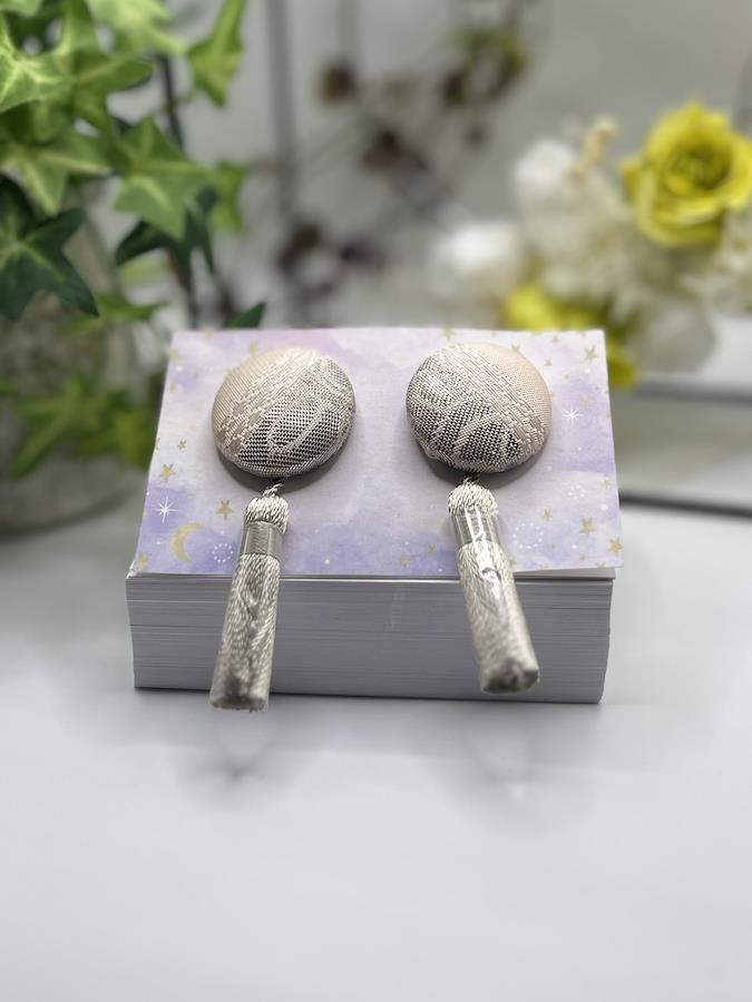 上品なベージュの金襴風生地で仕立てたくるみボタンピアスです。淡い色味のタッセルが優しく揺れ、フォーマルスタイルにも和装にも合わせられます。