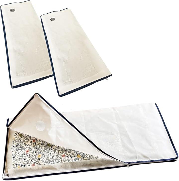 「商品仕様」サイズ/約幅88x奥行39x高さ2cm 本体重量:約90g カラー/ホワイトx藍色 内容/3枚 収納目安(袋1枚あたり)/着物(浴衣)1枚、材質/ポリプロピレン *洗えません 生産国:中国 *ご要望にお応えしファスナー部分が2方開きから3方開きに改良されました(2024年6月~)