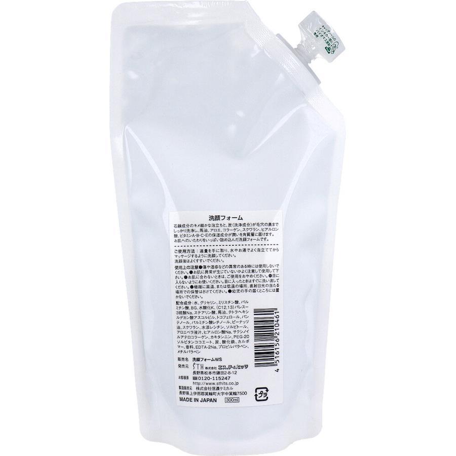 クリーミーな泡立ちを実感!優しく肌を包み込みます!●洗浄力がある炭でお肌の汚れを落とし、保湿力抜群の馬油を配合した究極の洗顔フォームです。●石鹸成分のキメ細やかな泡立ちと、炭(洗浄成分)が毛穴の奥までしっかり洗浄し、馬油、アロエ、コラーゲン、スクワラン、ヒアルロン酸、ビタミンA・B・C・Eの保湿成分が潤いを角質層に届けます。●お肌へのいたわりをいっぱい詰め込んだ洗顔フォームです。●そのまま使えるエコパック。詰替用としても。