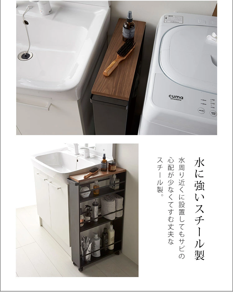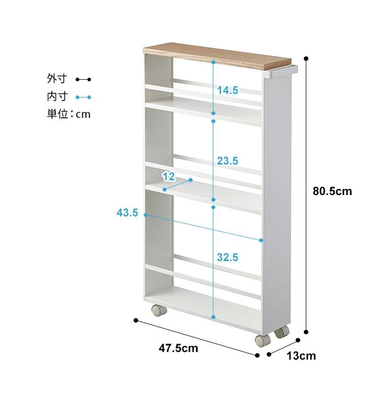 ■サイズ■高さ80.5(キャスター含む)×幅13×奥行47.5cm【天板】幅13×45cm【上段内寸】高さ14.5×幅12.5×奥行43.5cm【中段内寸】高さ23.5×幅12.5×奥行43.5cm【下段内寸】高さ32.5×幅12.5×奥行43.5cm【ガードの高さ】上段5.5cm:中段7cm:下段10cm※表記サイズより、多少の誤差があることがございます。