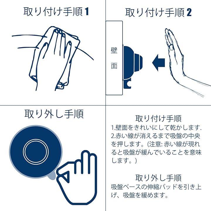 「使用上の注意」:吸盤は、目地線のある表面や多孔質の表面(木材、壁紙、天然石(トラバーチンなど)、塗装された壁、凹凸のある表面など)には適していませんのでご注意ください。