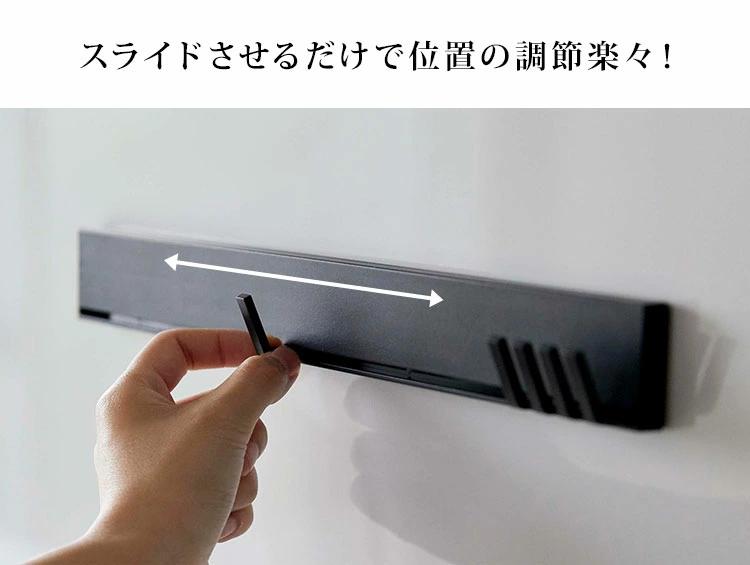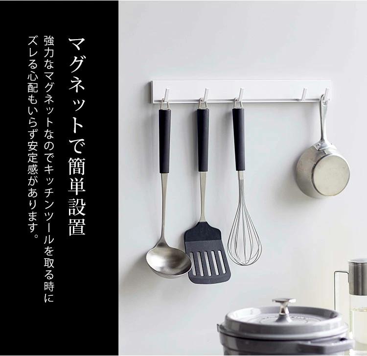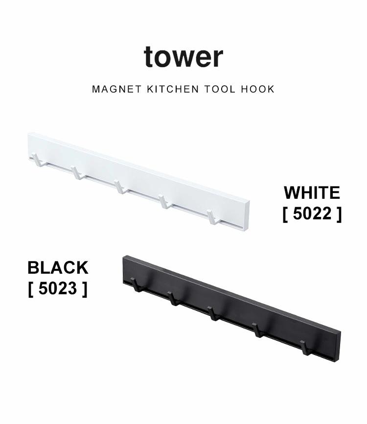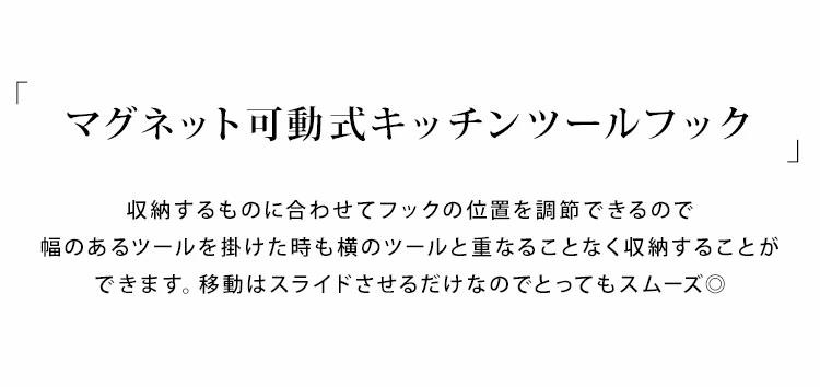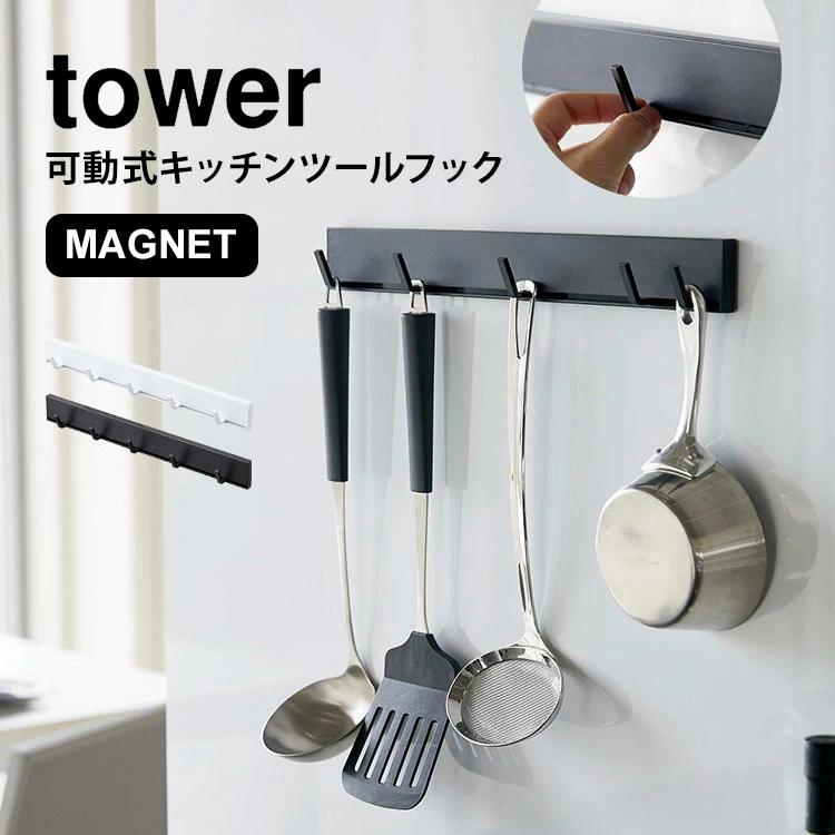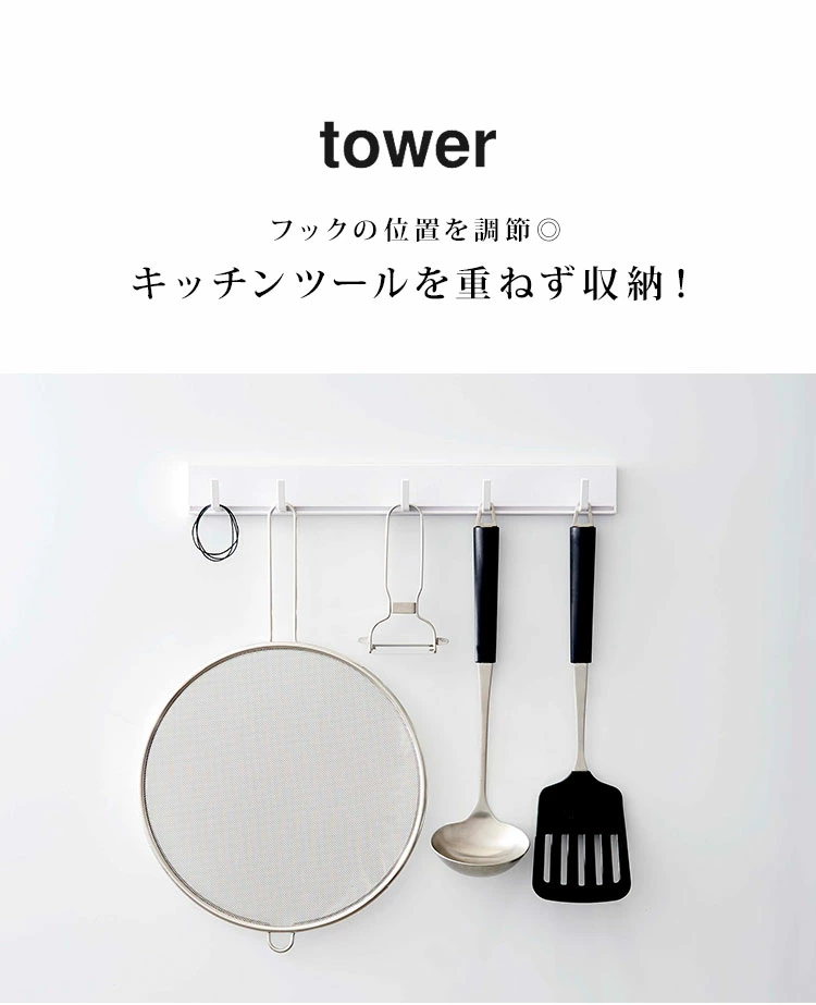 【マグネット可動式キッチンツールフック】丁寧な暮らしをするおしゃれさんたちにお届けする、シンプルながらもアイデアのつまったtowerシリーズ。強力マグネットで簡単取り付け!幅のあるキッチンツールを重ねずに収納出来る、可動式のキッチンツールフック。フックを横にスライドするだけで簡単に移動させることができます◎
