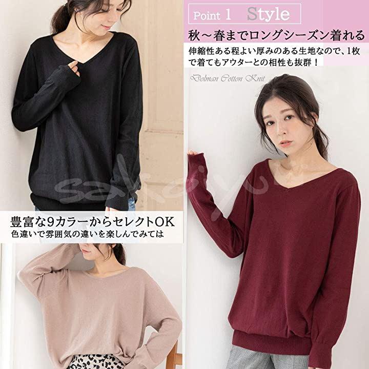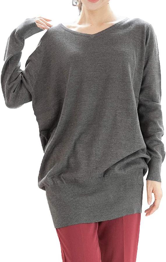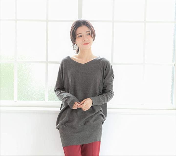 ・無地で程よく開いたVネックニットにはネックレスやブレスレットも映えます・きれいめ秋色カラーとちょっと長めのセミロング丈が、体型カバーしながら女性らしいスタイリングを1ランクUPし、秋冬コーデも簡単に。