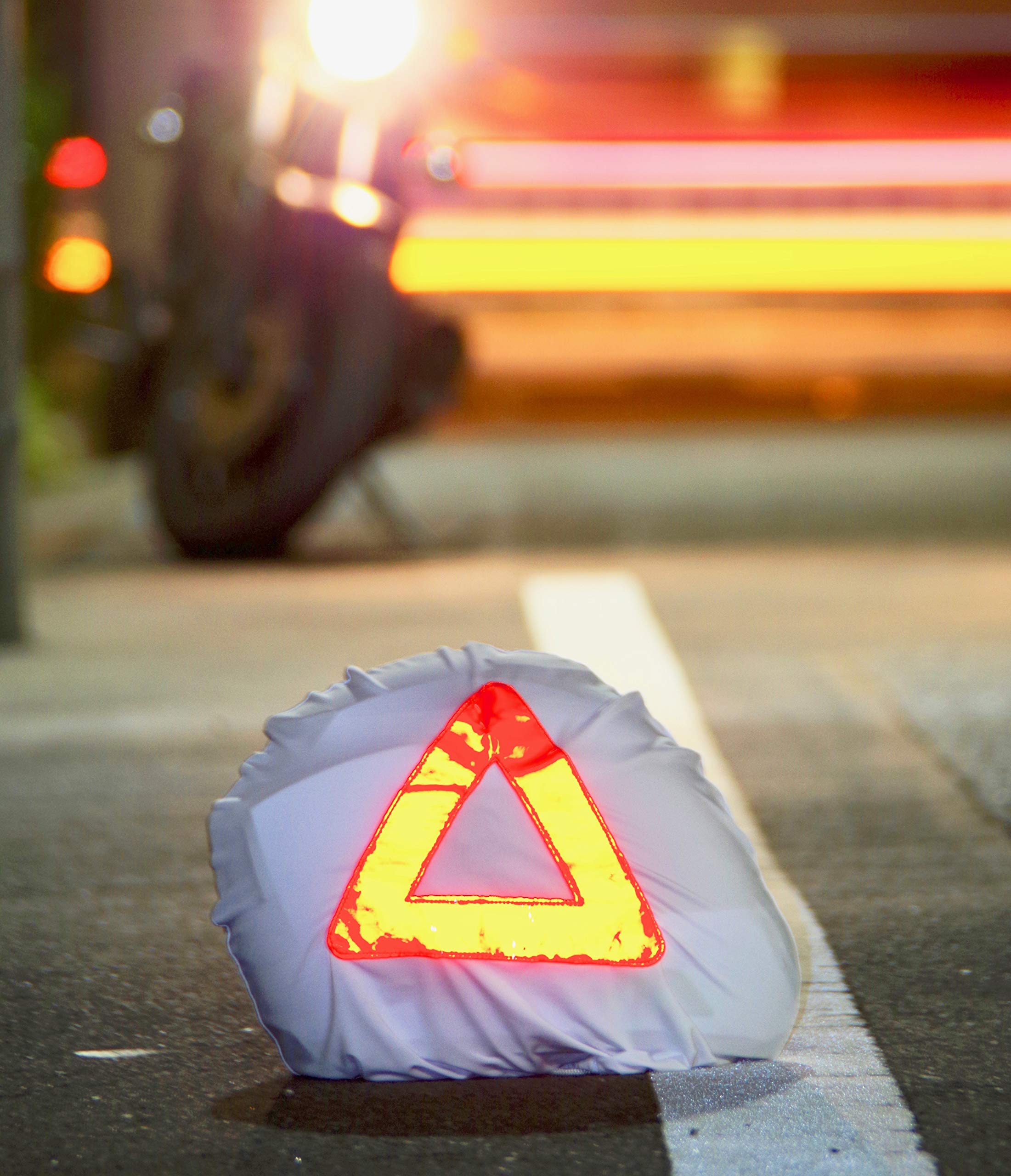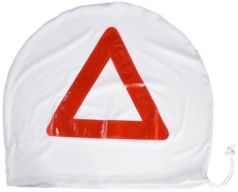 被視認性に優れる三角停止表示型のリフレクターを備えたヘルメットバッグ。/トラブル時にヘルメットを入れて路上に置き、後続車両の追突を避けるための三角停止板の替わりとして使用できます。携帯性が良いので常に携行したいアイテムです。