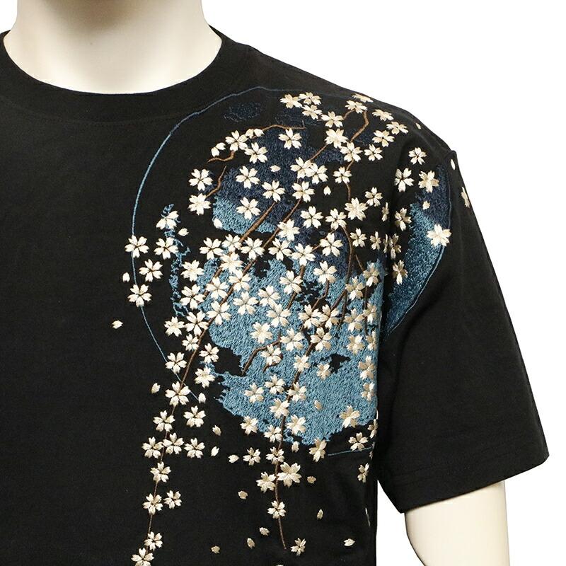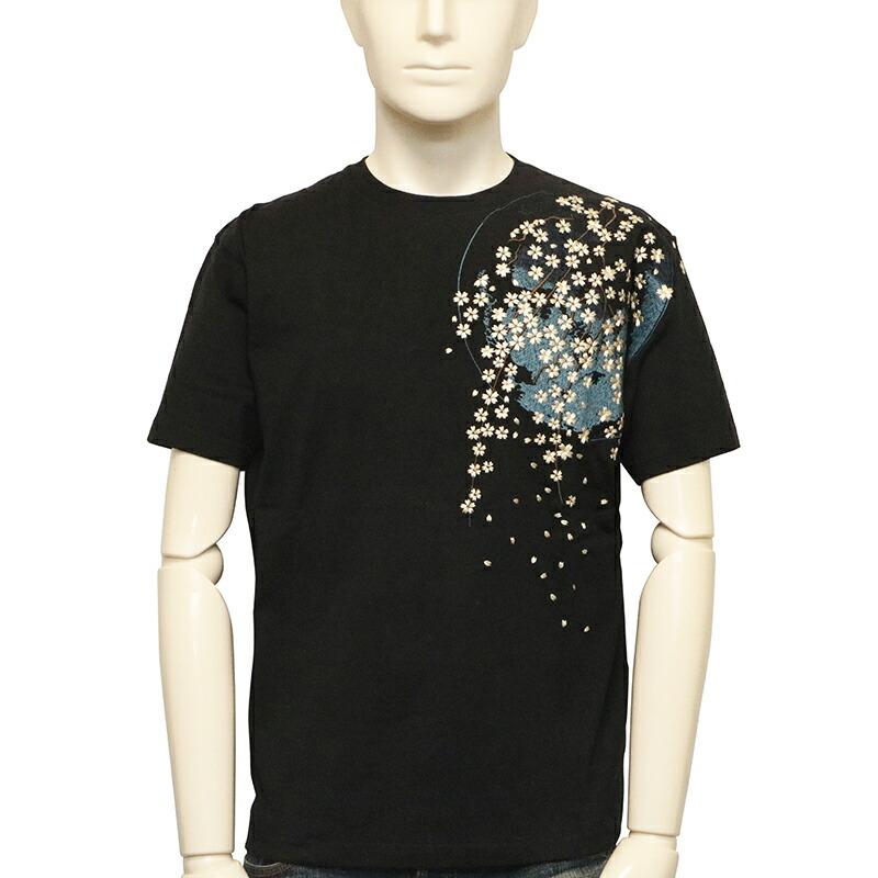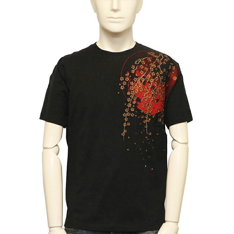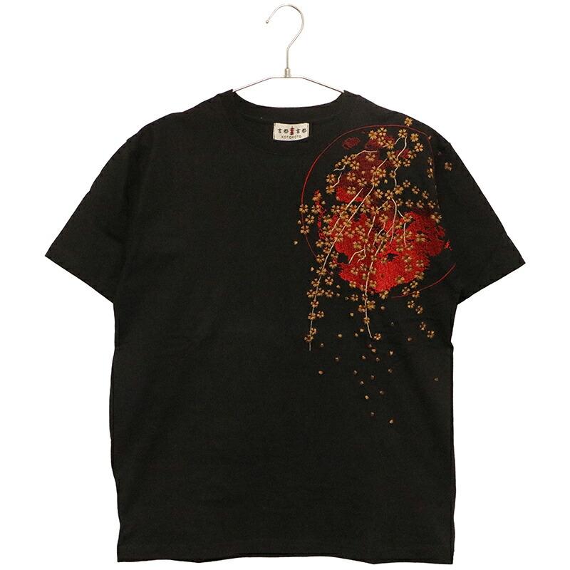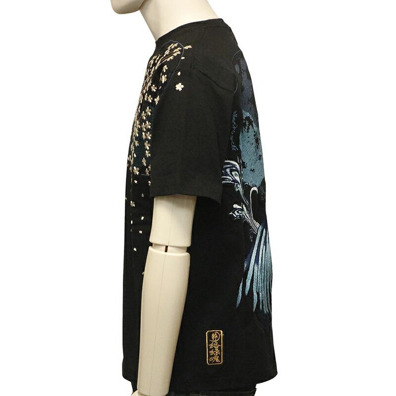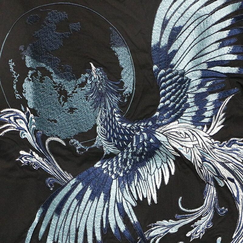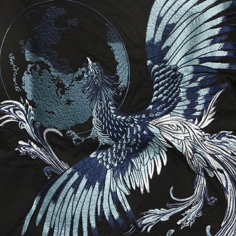 【デザイン】古都古都 × 絡繰魂 粋から和柄半袖Tシャツのご紹介です。鳳凰降臨 柄 刺繍 半袖Tシャツです。以前絡繰魂粋で好評だったデザインを古都古都でリバイバルしました。伝説上の神獣「鳳凰」が満月の夜に飛翔するド迫力な構図で落とし込んだ和柄半袖Tシャツ。フロントには左胸にかけて、満月と桜を組み合わせ刺繍で配置。ALL刺繍で粋にふさわしい迫力のある半袖Tシャツに仕上がりました。