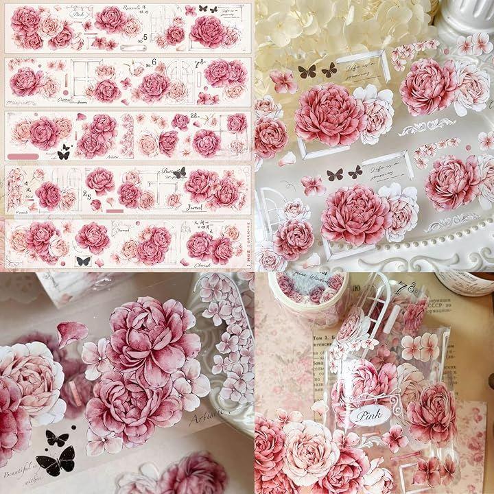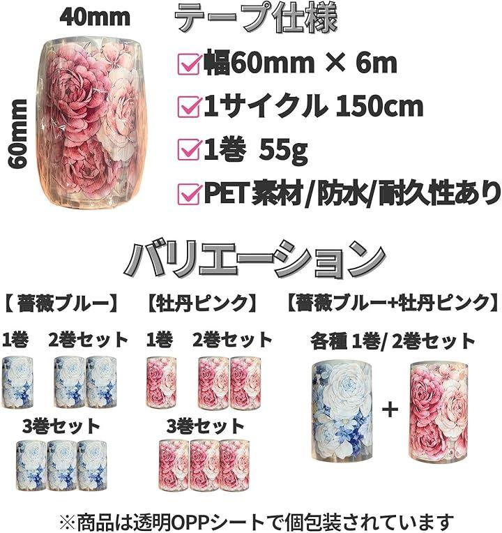 「素材」PET:光沢のある白インク剥離紙「サイズ」(薔薇、ブルー)1巻55mmx5m、1ループ約100cm (牡丹、ピンク)1巻60mmx6m、1ループ約150cm
