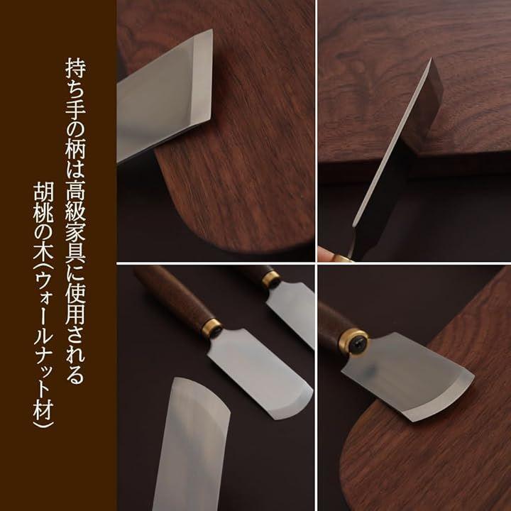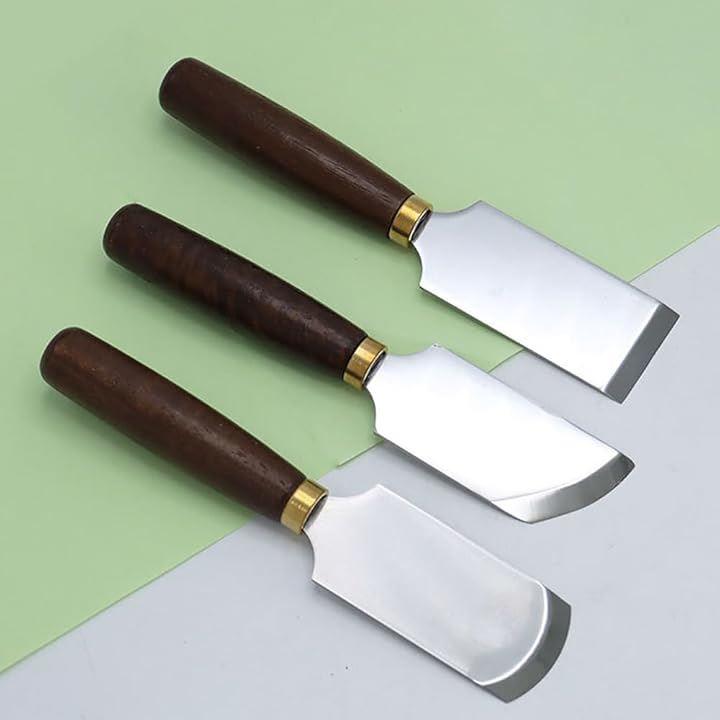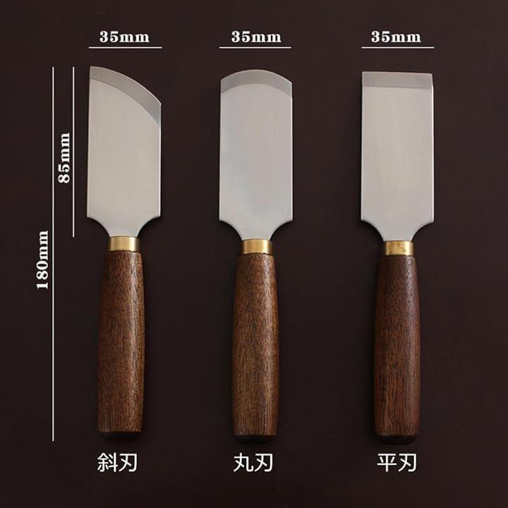 「概要」レザークラフトで革を削いだり、切ったり、革を漉くなどに利用する丸包丁、平包丁、斜包丁です。