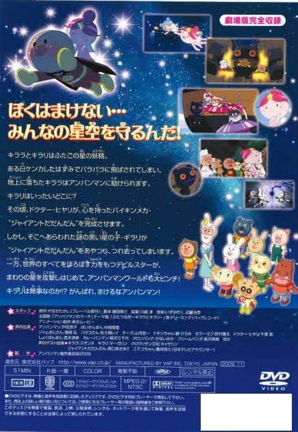 【それいけ!アンパンマン 映画シリーズ21作目 DVD化!】2009年7月~銀座テアトルシネマ ほか、全国ロードショー公開ひとりではちっぽけな力しか出せないけれど、相手を信じて力を合わせればなんだってできる!●劇場用映画シリーズ21作目のヒロインは、夜空の星を守る、かわいいふたごの星の妖精、キララとキラリ。大活躍のアンパンマン。さらにナゾの黒い星の子ギラリに、ジャイアントだだんだんも登場してハラハラドキドキ。●原作者・やなせたかし先生から、この映画を通じて子どもたちへ伝えたい大切なメッセージは、勇気と団結と信じる心です。これはアンパンマンの永遠のテーマでもあります。【おはなし】キララとキラリは星の杖で夜空を輝かせるふたごの星の妖精。元気いっぱいのキララは「もっともっと星を飛ばして夜空を明るくするのよ!」といって、キラリの注意も聞かず杖を振り回します。ところが、ふたりの杖がぶつかり、そのいきおいでふたりはバラバラに飛ばされてしまいます。アンパンマンに助けられたキララは一緒にパン工場へ。その頃バイキン城では、ドクター・ヒヤリが、ばいきんまんのために開発した“心を持ったメカ”ジャイアントだだんだんを完成させるところでした。ところが、ジャイアントだだんだんの胸から、黒い杖を持ったこども、ギラリが突然あらわれ、ジャイアントだだんだんを操って去ってしまいます。夜空から星が消え、デビルスターがあらわれます。クロワッサン星、ゴミラの星、鉄の星は、デビルスターの光線を浴びて、みんな真っ黒な塊にされてしまいます。近づくデビルスターを止めようとするキララですが、一人ではどうすることもできません。そこへばいきんまんがやってきて、ジャイアントだだんだんでアンパンマンたちをおそいます。がんばれ、アンパンマン! みんなの心に星の光がある限り!【キャスト&スタッフ】アンパンマン:戸田恵子ばいきんまん:中尾隆聖ジャムおじさん:増岡弘/バタコさん:佐久間レイチーズ:山寺宏一/ドキンちゃん:鶴ひろみ