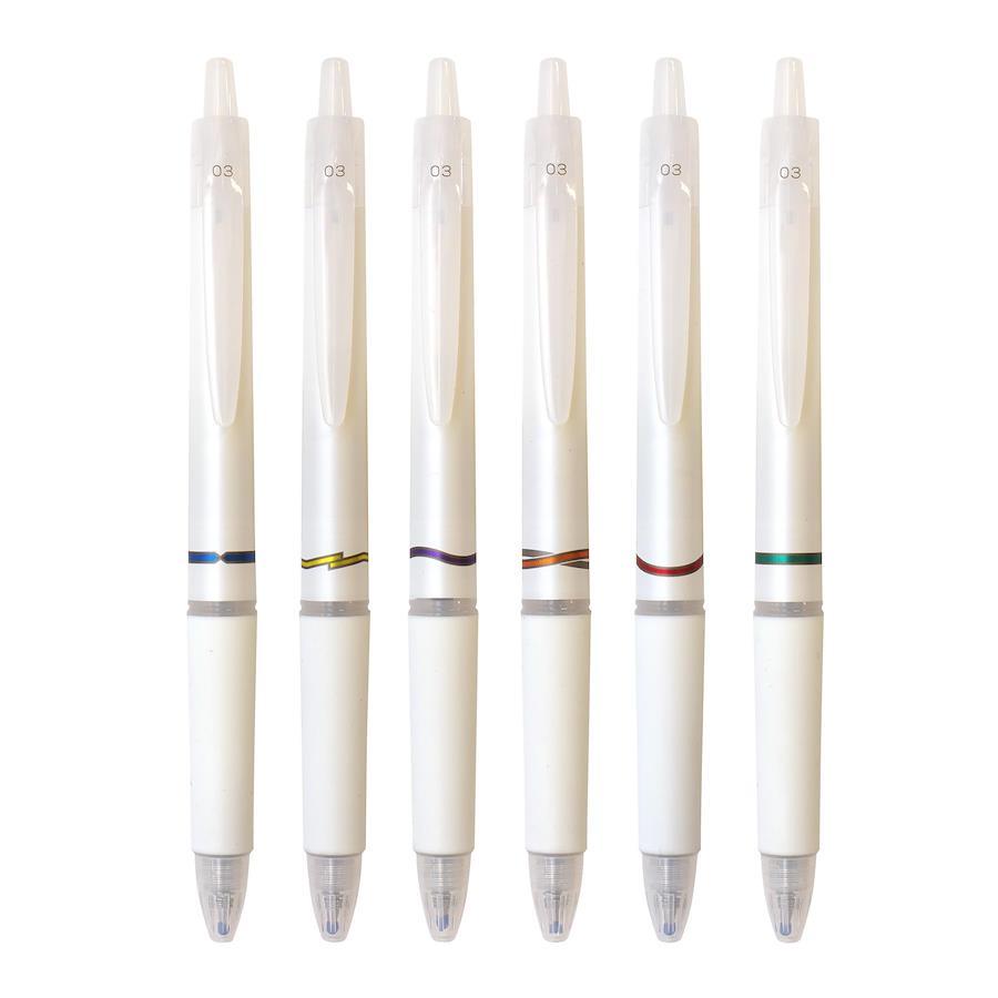「アクロインキ」を採用した「アクロ」シリーズの限定ボールペン。それぞれに意味を持たせたボディカラーとリングのモチーフにより、“なりたい自分”を表現できます。。リングのモチーフはレッド(自信)、ブルー(冷静)、イエロー(ひらめき)、オレンジ(明るさ)、グリーン(自然体)、バイオレット(気品)の願いを表わす6色のラインアップ。。