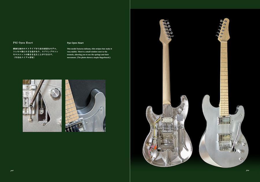 【P92 Open Heart】繊細な細めのストライプが美しいモデル。トレモロ横に小さな穴があり、スプリングやトレモロユニットの動きを見ることができます。________________________