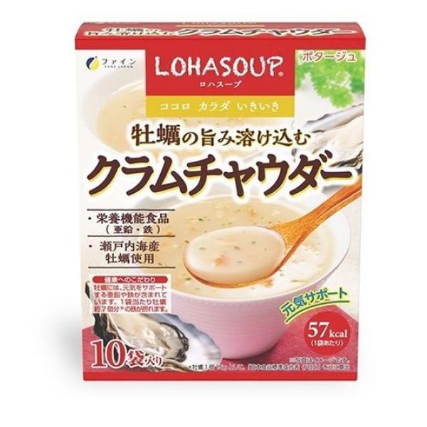 製品の特徴●LOHASOUP ロハスープ 牡蠣の旨み溶け込むクラムチャウダー ポタージュ●57kcal(1袋あたり)●牡蠣の旨みをしっかり実感:瀬戸内海産の牡蠣を使用し、ホタテや野菜の風味を重ねて仕上げた、濃厚スープです。さらに、北海道産ホタテ、じゃがいも、たまねぎ、にんじん、パセリを加え、素材の風味が溶け込んだコク深いスープに仕上げました。●不足しがちなミネラルを手軽に補給:牡蠣には亜鉛や鉄といった、普段の食事だけでは不足しがちなミネラルが含まれています。本品は、牡蠣エキスを配合し、美味しさをとことん追求しました。何度も試作を重ね、満足のいく味に仕上げました。●「食事にプラス一品」、「小腹が空いた時の軽食」など忙しい日々の中で手軽に行える栄養補助として、様々な食事シーンでみなさまの元気をサポートします。●瀬戸内海産牡蠣、北海道産のホタテ使用●1食(1袋)当たり、牡蠣約7個分(*)の鉄が補給できる[*牡蠣1個15gとして、「日本食品標準成分表(八訂)」を元に算出]●栄養機能食品(亜鉛・鉄)