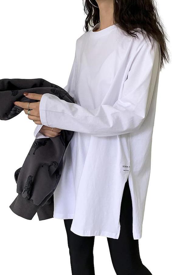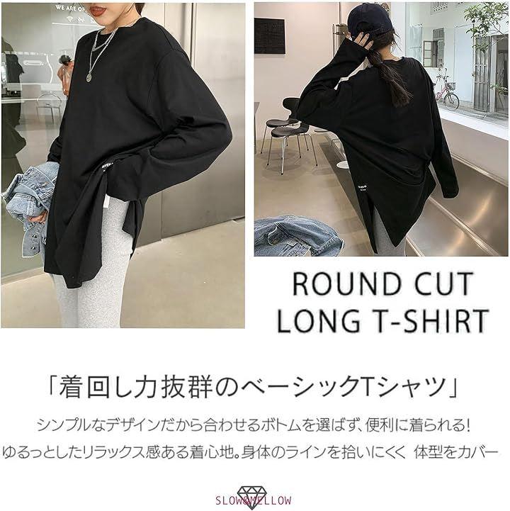 近年トレンドのビッグシルエットデザインの長袖Tシャツです*シンプルなデザインでどんなスタイルとも相性抜群。裾にスリットの入ったラウンドカットデザインでこなれ感を演出*ワンポイントのラベルロゴがアクセントでお洒落。