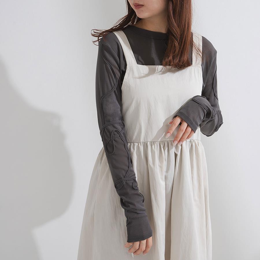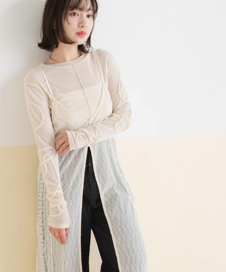 【素材】透け感のあるシアー素材。肌触りもよくソフトな着心地を体感していただけます。※繊細な素材感のため取り扱いにはご注意くださいませ。