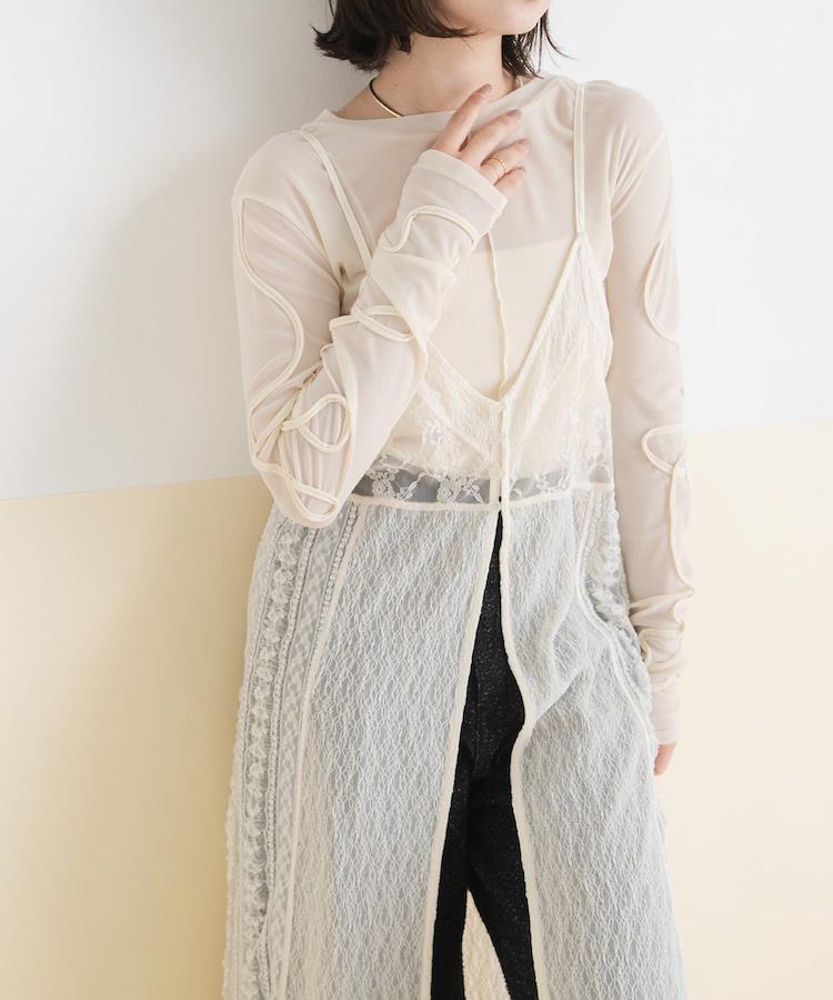 【素材】透け感のあるシアー素材。肌触りもよくソフトな着心地を体感していただけます。※繊細な素材感のため取り扱いにはご注意くださいませ。