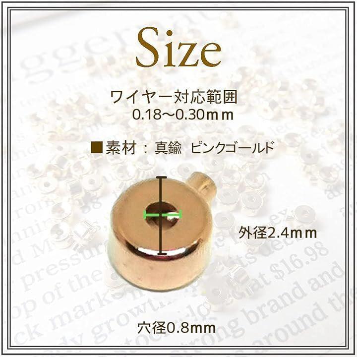 「サイズ・仕様」外径:約2.4mm/内径:約10.8mm、対応ワイヤー径:約0.18mm~0.30mm(テグス・アクセサリーワイヤー対応)、材質:真鍮(ロジウムメッキ)、カラー:ピンクゴールド、入数:10個、生産国:日本(Made in Japan)