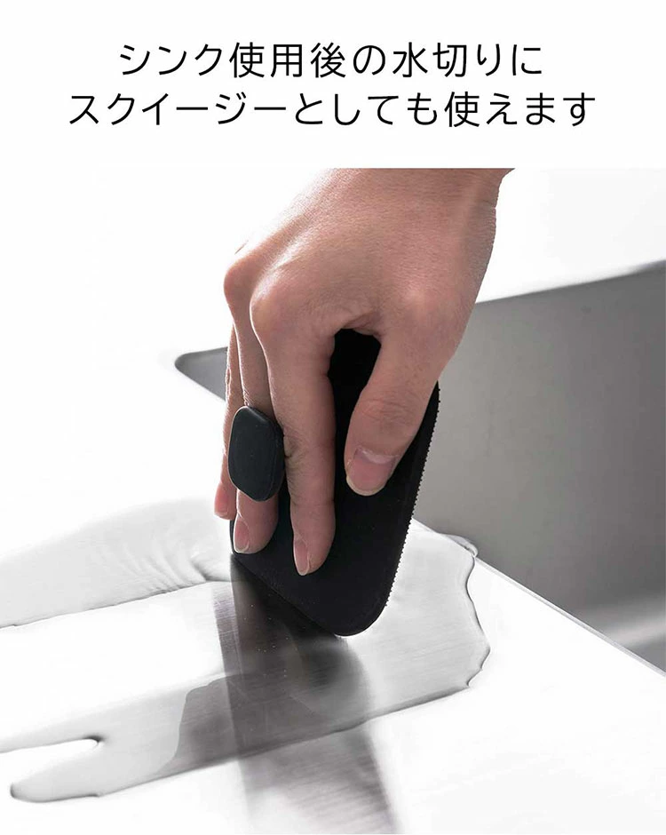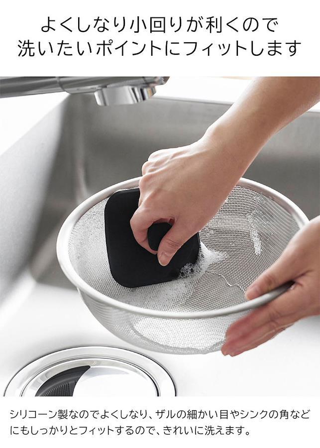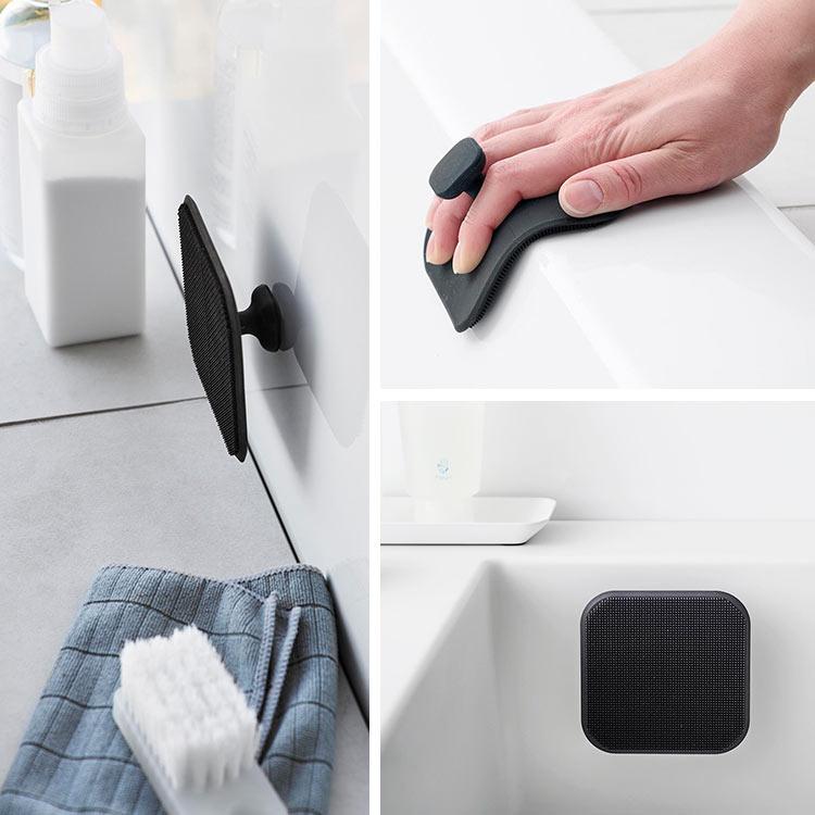 【マグネットキッチンシリコーンスポンジ】マグネットがつく壁面に簡単設置。小回りがきく柔らかいシリコーン製スポンジ。食器やザルの細かい網目などの調理器具やシンク中までしっかり洗える泡立ちのいいスポンジです。スポンジ面が壁面に触れないので、乾きやすく衛生的です。スクイージーにもなるので、キッチンやシンク周りの水切りに。