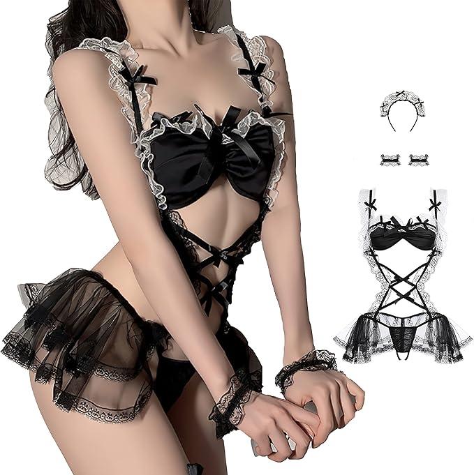 ■商品名[MAKUMOKO] メイド服 コスプレ セクシー エッチなコスチューム レース 女仆 ベビードール エロ下着 可愛い かわいい 連体 下着 ランジェリー 胸空き cosplay costume 過激 仮装 4点セット