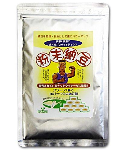 納豆を乾燥・粉末にして更にパワーアップさせた「まるも 粉末納豆」は美容と健康のために食べるプロバイオティクス食品です。純度100%にこだわった当商品はスプーン1杯(約2g)で10パック分の納豆菌に相当します。納豆嫌いな方にも是非、おすすめしたい商品です。ナットウキナーゼを簡単に摂取する事が出来ます。又、酸化防止剤等は一切使用しておりません。遺伝子組替えの大豆も使用していないので安心してお召し上がり下さい。お召し上がり方:1日2~3回を目安に小さじ1杯を ・豆乳、ヨーグルトなどに混ぜて・ご飯にふりかけて・味噌汁に入れて・納豆にふりかけて更にパワーアップ