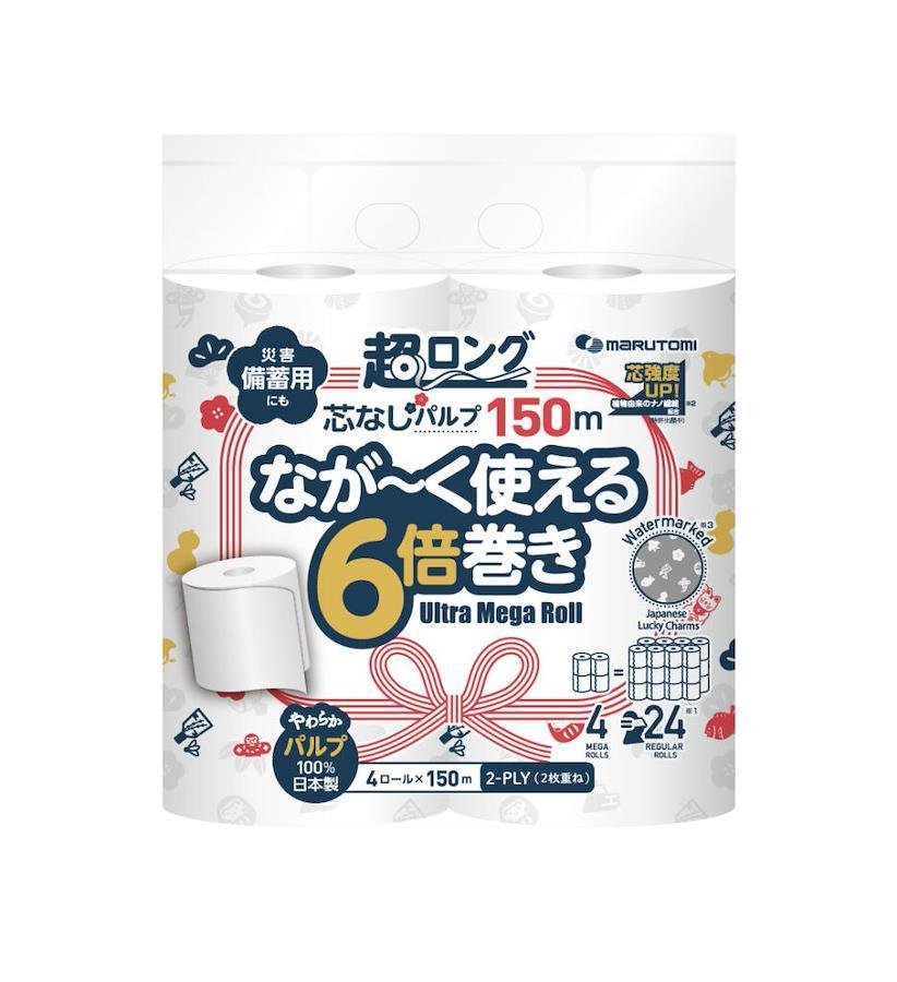 『超ロング6倍巻き』なら、たったの4ロールで一般的なトイレットペーパー(※)の長さ24ロール分に相当します。