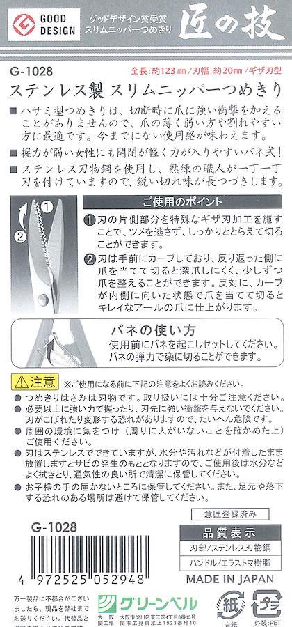 商品紹介ステンレス製スリムニッパーつめきり●ハサミ型つめきりは、切断時に爪に強い衝撃を加えることがありませんので、爪の薄く弱い方や割れやすい方に最適です。今までにない使用感が味わえます。●握力の弱い女性にも開閉が軽く力が入りやすいバネ式!●ステンレス刃物鋼を使用し、熟練の職人が一丁一丁刃を付けていますので、鋭い切れ味が長つづきします。ご注意(免責)>必ずお読みください☆でのお届けです。とはポストや新聞受け等への投函でお荷物をお届けする配送方法です。配でお届けいたしますが、宅急便と違い配達中の紛失・破損、投函後の盗難等へのお荷物の補償はございません。ご了承のうえ、ご注文ください。