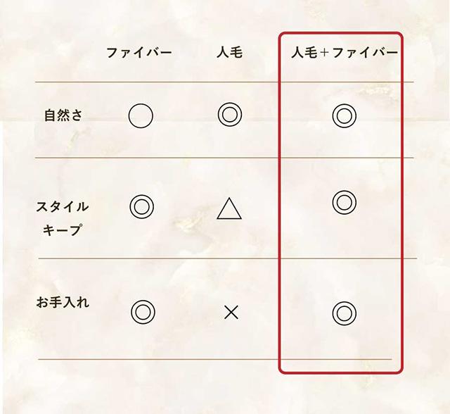 ウィッグ特有のツヤを軽減した新ファイバーと人毛をミックス。