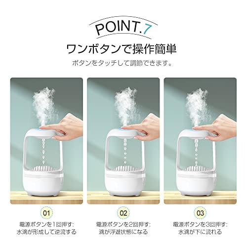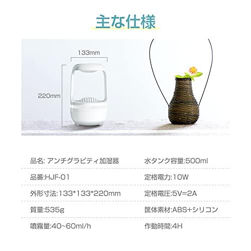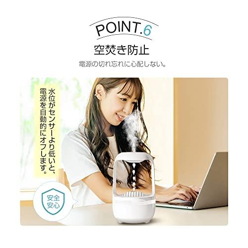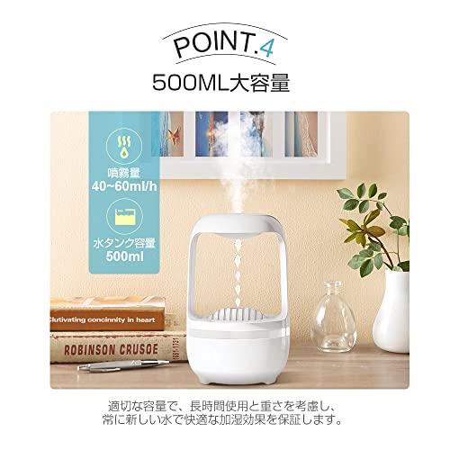 通常1-5営業日で発送:【水が逆流するクリエイティブデザイン!】シンプルで美しい砂時計に反-重力マジックブラックを組み込んで、ファンタジックな水のイリュージョンを感じましょう。砂時計の水玉が視覚効果によって自動的に上昇し、視覚を覆すような幻想的な旅が始まります。【乾燥対策に加湿器の導入を】部屋の理想的な湿度は40~60%です。部屋で快適に過ごすためには適度な湿度を保つことが大事です。特に、冬の時期は暖房を使用するため湿度が下がりがちになります。また、乾燥は肌のトラブルを引き起こすため、加湿器の導入がおすすめです。【500ML大容量水タンク】更に使い勝手よくリニューアルし、たっぷりの500ML大容量水タンク。噴霧量は40~60ml/hだから、長時間持続に加湿できます。就寝時の使用にぴったりです。【静音加湿】音は40デシベル以下、ポンプ本体は低騒音で安定した性能を発揮し、水滴のカチカチ音はほとんど聞こえません。仕事中や寝ているときは、図書館にいるのと同じくらい静かです。【ワンボタンで機能操作】シンプルな芸術をワンタッチで開き、内外装を兼ねた優雅さを実現。すべての機能を、1つのボタンで簡単に切り替えられます