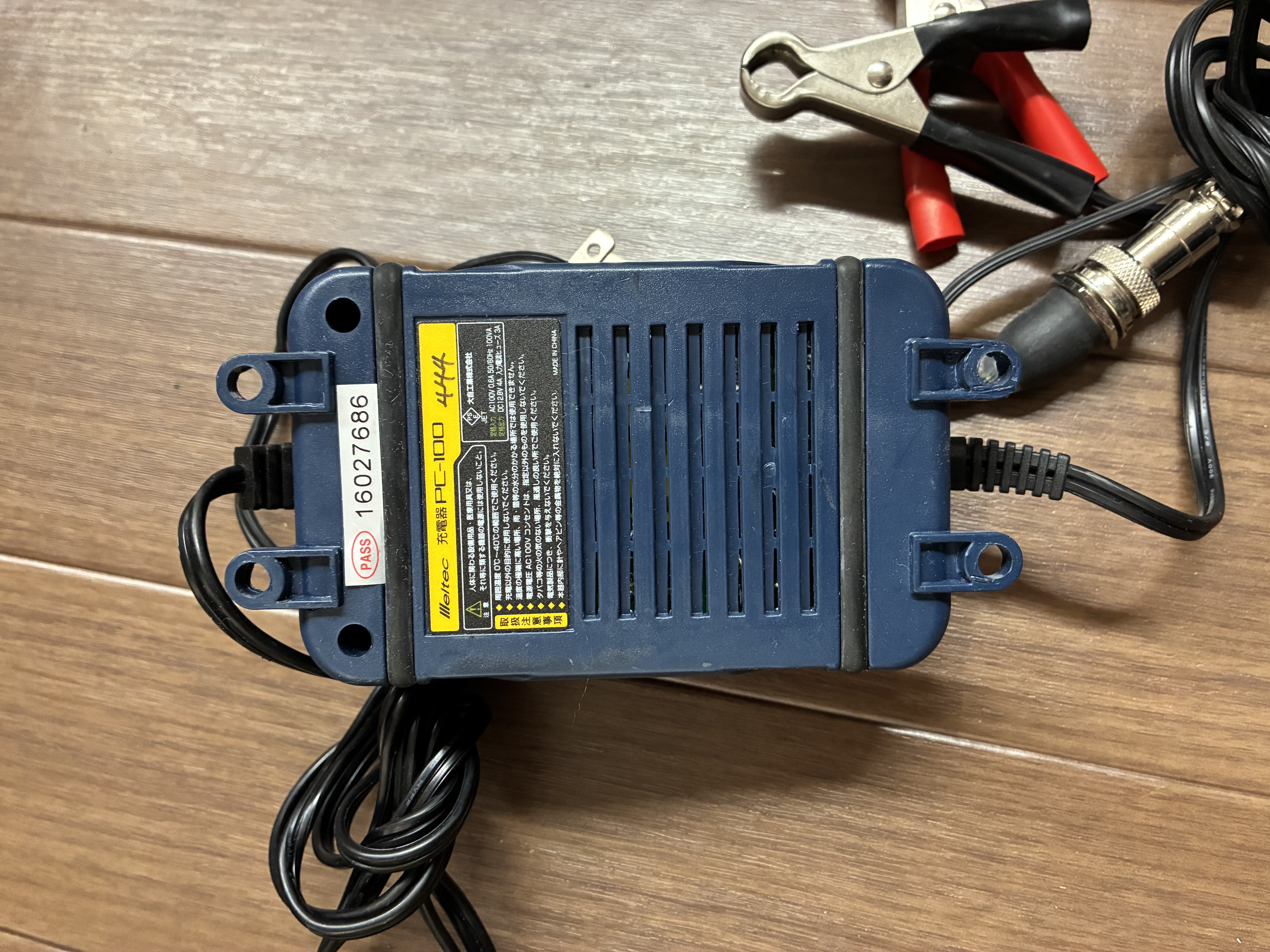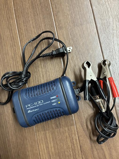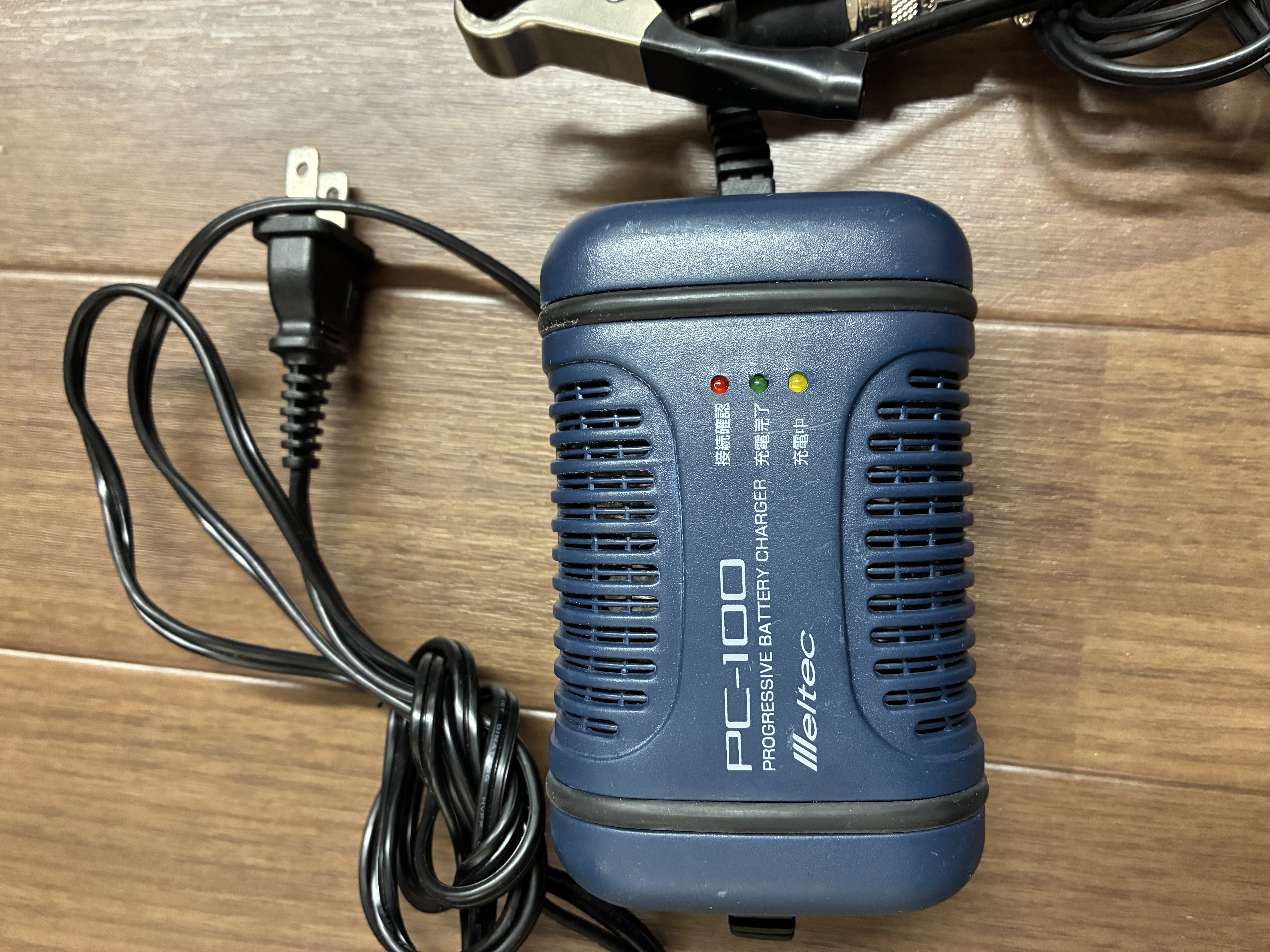 Meltec(メルテック) のバッテリー充電器 PC-100です。自動二輪車から軽自動車まで対応した、12Vバッテリー用のフルオート充電器です。小型で持ち運びに便利です。適合バッテリー: DC12Vの開放型・密閉型鉛バッテリー。容量は4Ah~40Ahに対応しています。定格出力: DC12V/4A。