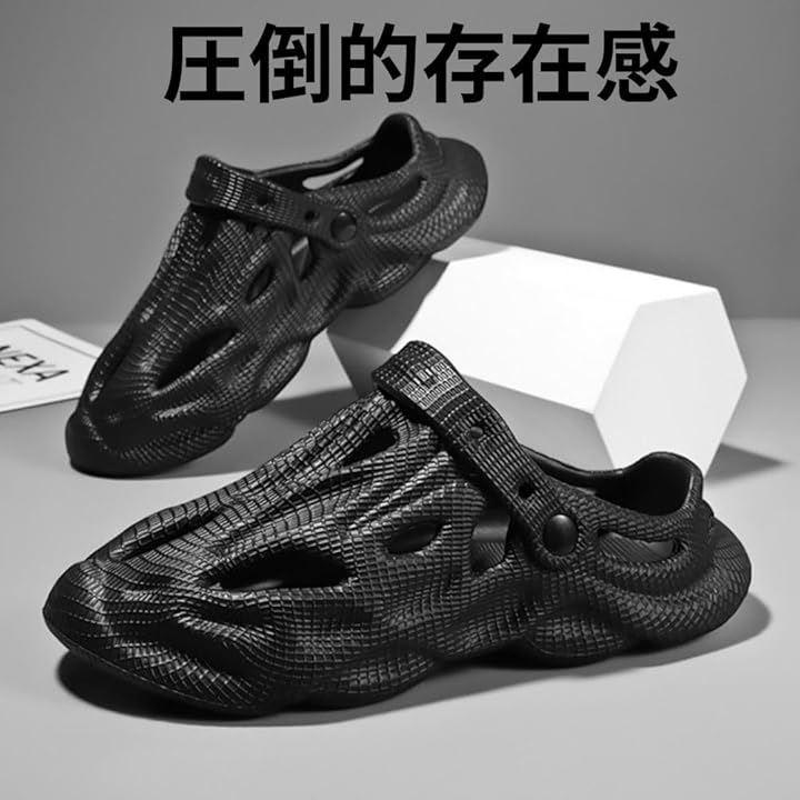 「ごつい質感が目をひく個性派サンダル」恐竜やワニを思わせるようなごつごつとした大型爬虫類風の質感が特徴のユニークなサンダル。