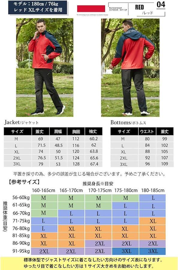 「利用シーン」登山、釣り、バイク、アウトドア、キャンプ、サイクリング、スポーツ、防災など 「機能」*ジャケット:撥水加工(耐水圧7,000mm)、防風、防寒 *速乾トレッキングパンツ:撥水加工(耐水圧2,000mm)、防風、速乾、伸縮 「カラー」ブラック、ブラウン、ブルー、ネイビー、グリーン、レッド 「重量」ジャケット約660g、パンツ約350g 「メイン素材」ポリエステル 「サイズ」M~3XL <ジャケット> 着丈 /肩幅/胸囲 /袖丈 [M] : 69 / 47 / 112 / 60.2 [L] : 71.5 / 48.5/ 116 / 62 [XL] :74 / 50 / 120 / 63.8 [2XL] :76.5 / 51.5 / 124 / 65.6 [3XL] :79 / 53 / 128 / 67.4 <パンツ> ウエスト /着丈 [M] : 80 / 99 [L] : 84 / 102 [XL] :88 / 105 [2XL] :92 / 107 [3XL] :96 / 109
