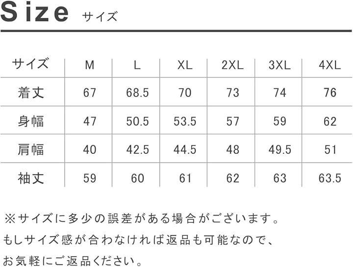 「サイズ」「M」着丈67 / 身幅47 / 肩幅40 / 袖丈59・「L」着丈68.5 / 身幅50.5 / 肩幅42.5 / 袖丈60・「XL」着丈70 / 身幅53.5 / 肩幅44.5 / 袖丈61・「2XL」着丈73 / 身幅57 / 肩幅48 / 袖丈62・「3XL」着丈74 / 身幅59 / 肩幅49.5 / 袖丈63・「4XL」着丈76 / 身幅62 / 肩幅51 / 袖丈63.5 *サイズに多少の誤差がある場合がございます。