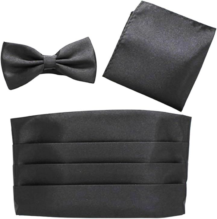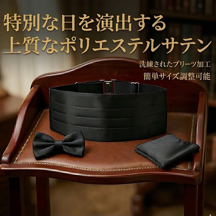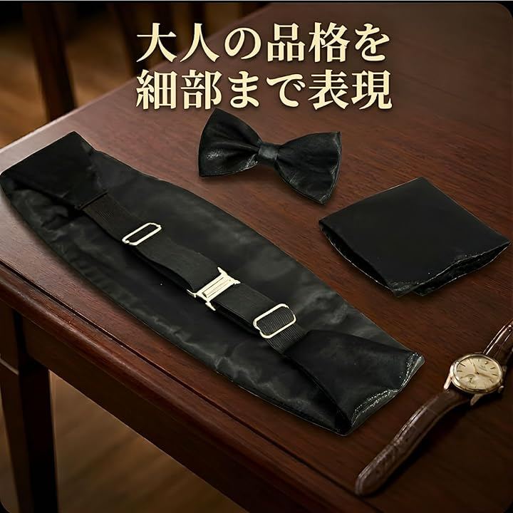 「コーディネートに悩まない、3点セット」タキシードスタイルに必須のカマーバンド、蝶ネクタイ、ポケットチーフを、統一感のある上質な素材で揃えました。