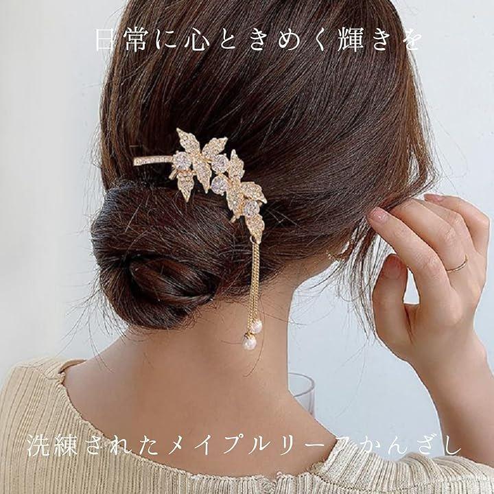 「メープルリーフモチーフのかんざし」メープルリーフをモチーフとしてキュービックジルコニアをセッティングした二本挿し簪は、パールチェーンを付けていますので風に揺れると優美さを演出します。