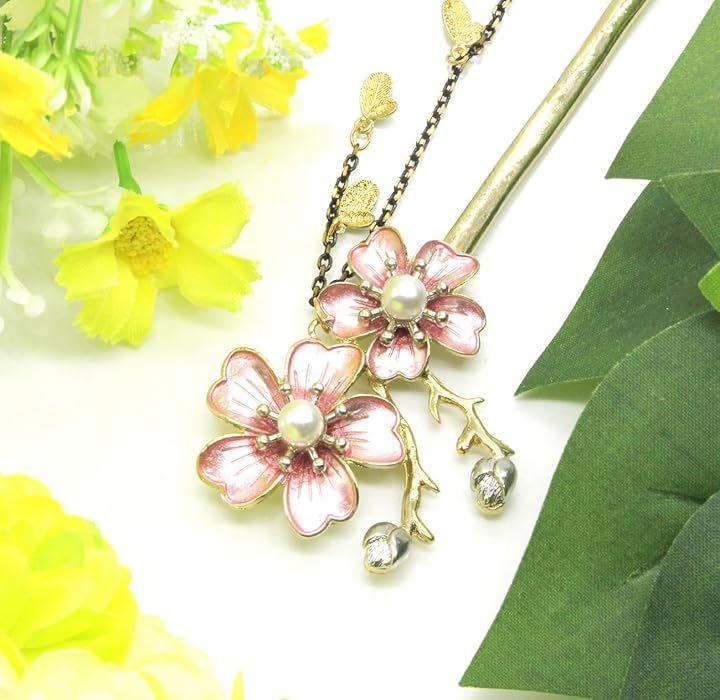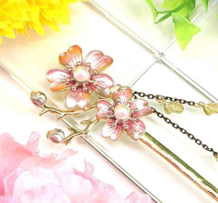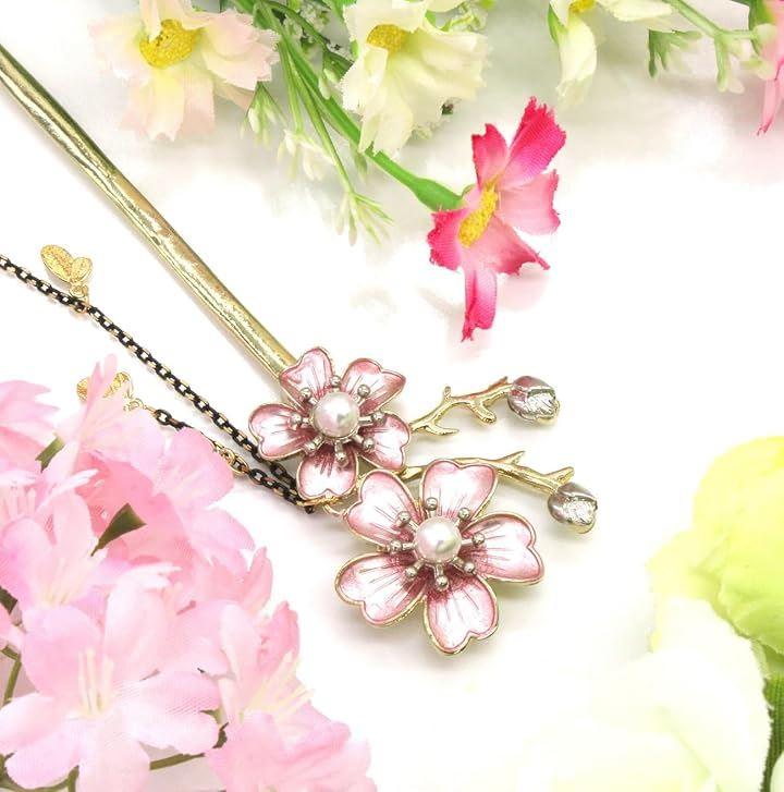 「桜モチーフ一本挿しかんざし」人気の桜の花をモチーフとした一本挿し簪は、ほんのり薄化粧した淡いピンクの色合いのある花びらをセッティングして、飾りチェーンは桜の花びらがひらひらと舞う様子を表現しています。