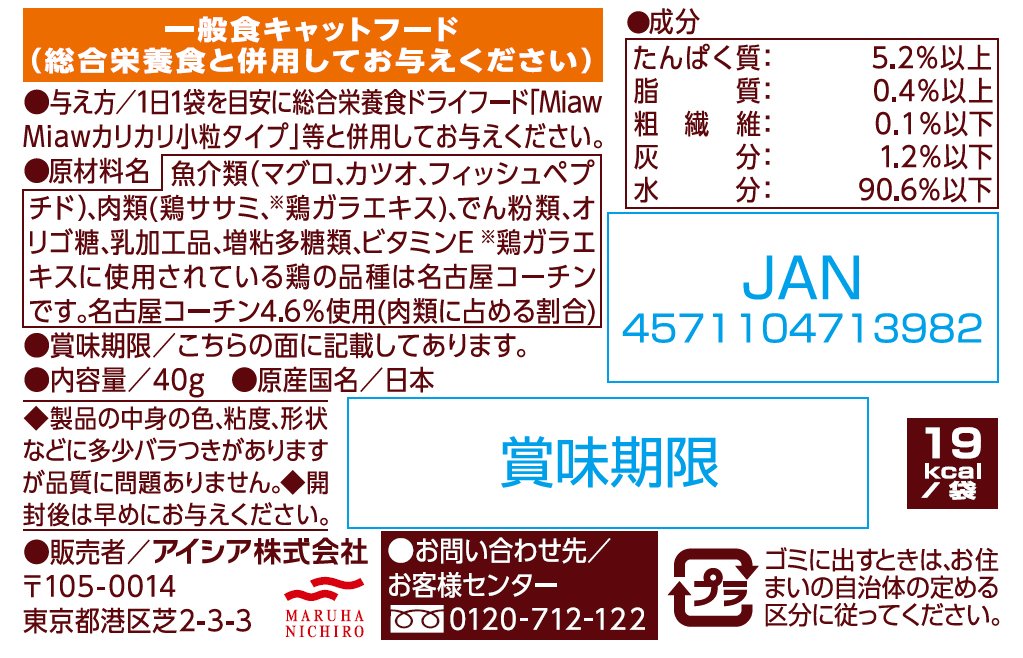 1日1袋を目安にアイシアの総合栄養食ドライフード「MiawMiawカリカリ小粒タイプ」等と併用してお与えください。