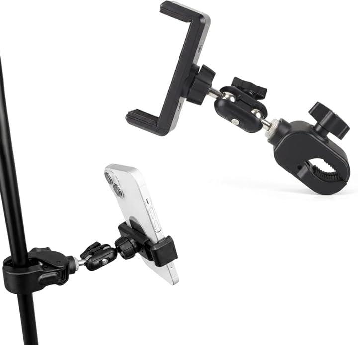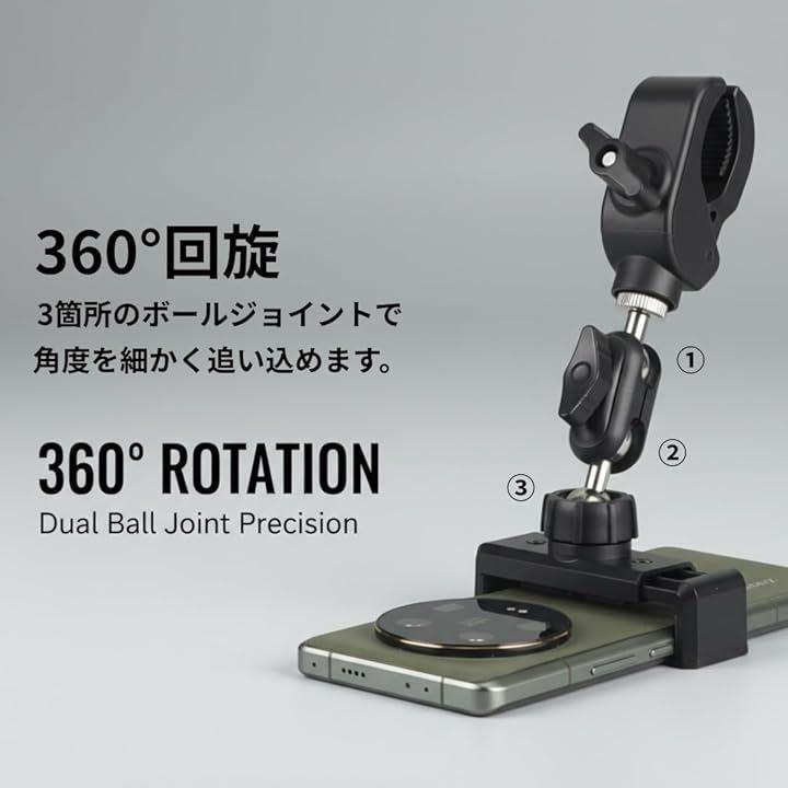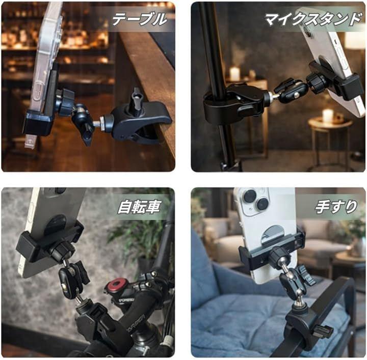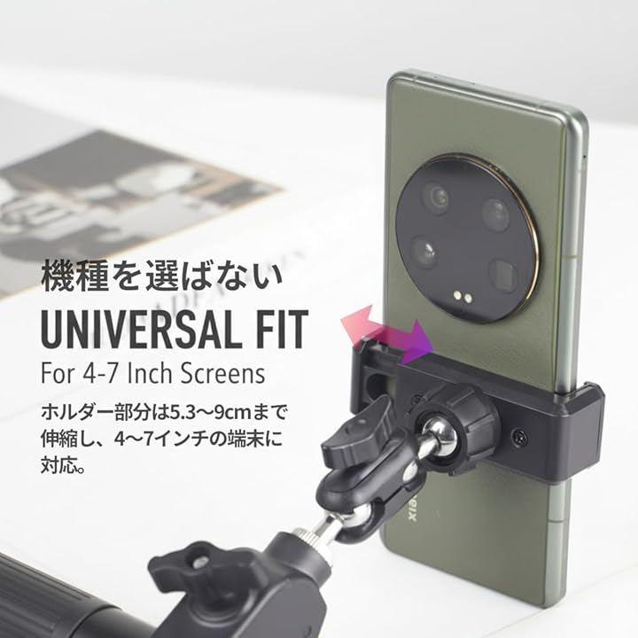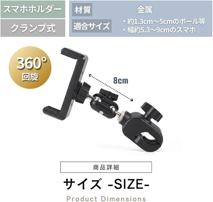 「商品内容」適合サイズ(約):横幅5.3~9cmのスマートフォン(iPhone 17 proMAX可) 取付先1.3~5cmのポール 主な材質:金属 *サイズ詳細は商品画像をご確認ください。