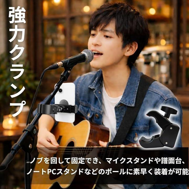 コンパクトで持ち運びに困らず、演奏や収録の動線を確保しながらスマホを定位置に固定できます。
