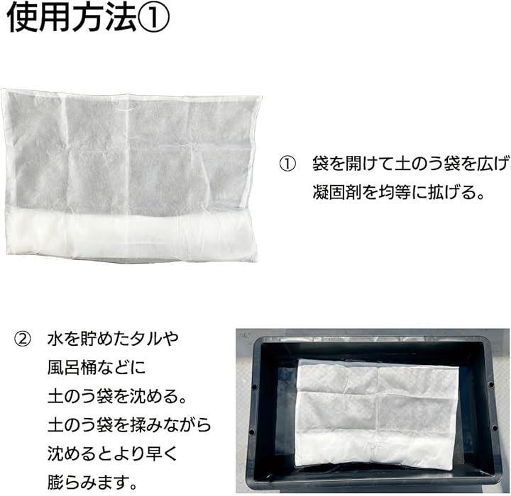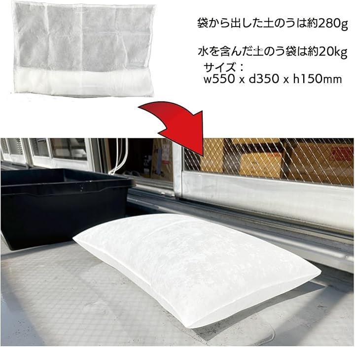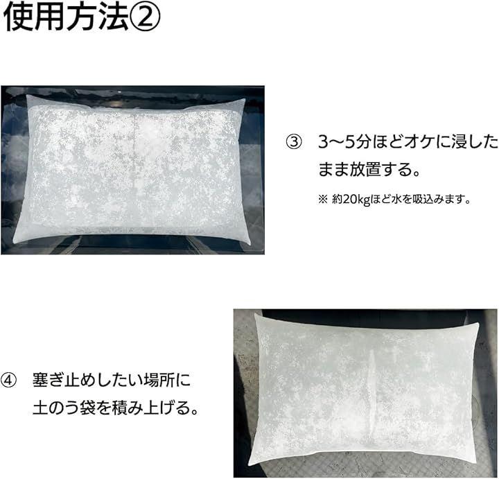 吸水性土のう袋 水に5分ほど浸してるだけで重さ20kgの土のう袋に。使用後は天日干しで土のう内の水分を乾燥させてから一般可燃ごみとして処理できます。