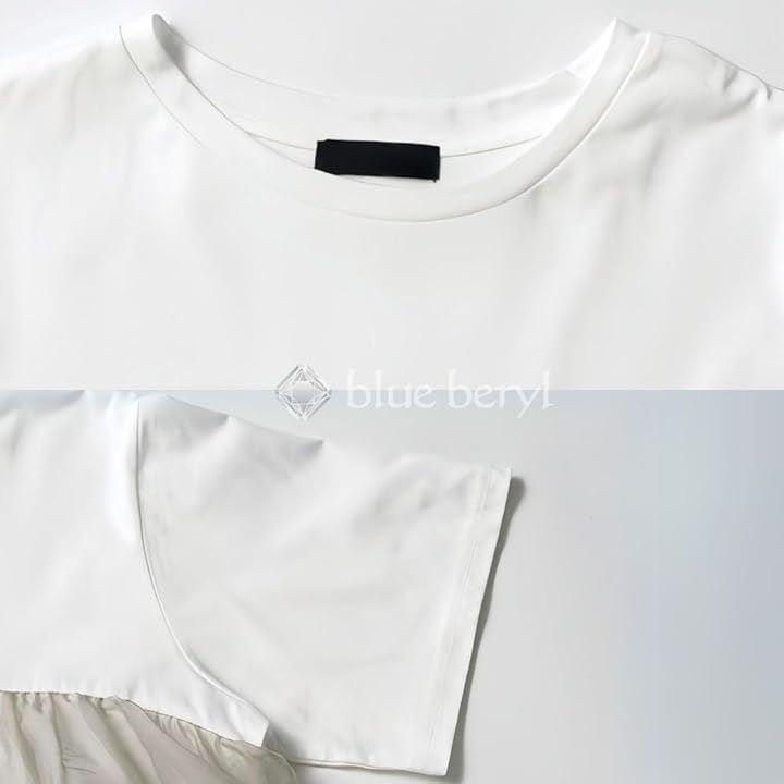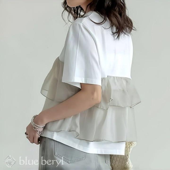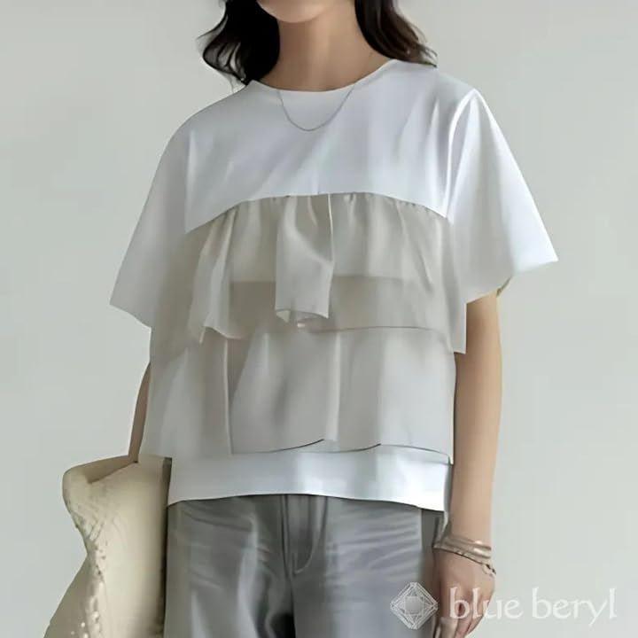 「異素材ミックスで叶える軽快な着心地」 さらりとした手触りのポリエステル素材を使用したカットソー生地に、透け感のある軽やかなフリルをドッキング。