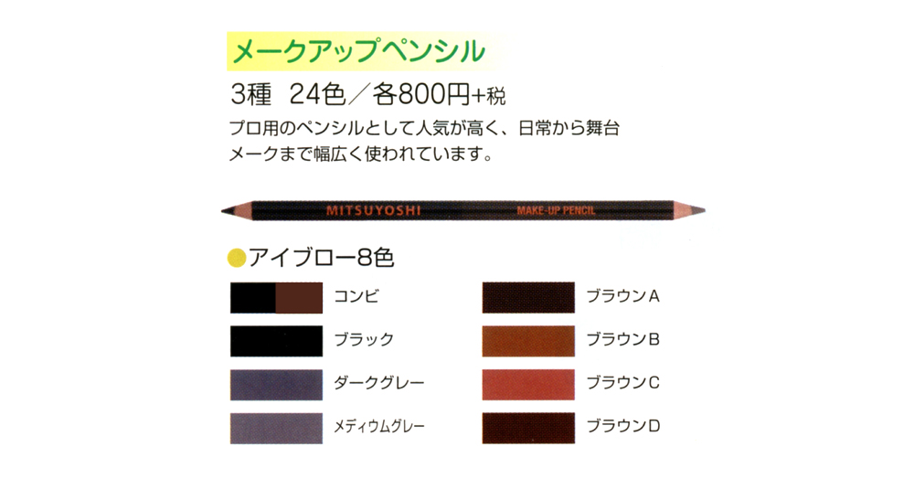 眉、目、口の周囲に使用するペンシルタイプの化粧品です。メークアップ用のペンシルとして人気が高く、日常から舞台メークまで幅広く使われています。アイブロー用、アイライナー用、リップライナー用があります。【内容成分】(ブラック)ステアリン酸・モクロウ・パラフィン・マイクロクリスタリンワックス・水添ヤシ油・ミネラルオイル・ミツロウ・水添パーム核油・水添パーム油・トコフェロール・カーボンブラック【メーカー】 株式会社 三善【区分】日本製 化粧品【広告文責】株式会社グローバル通販、連絡先:0120-34-3728