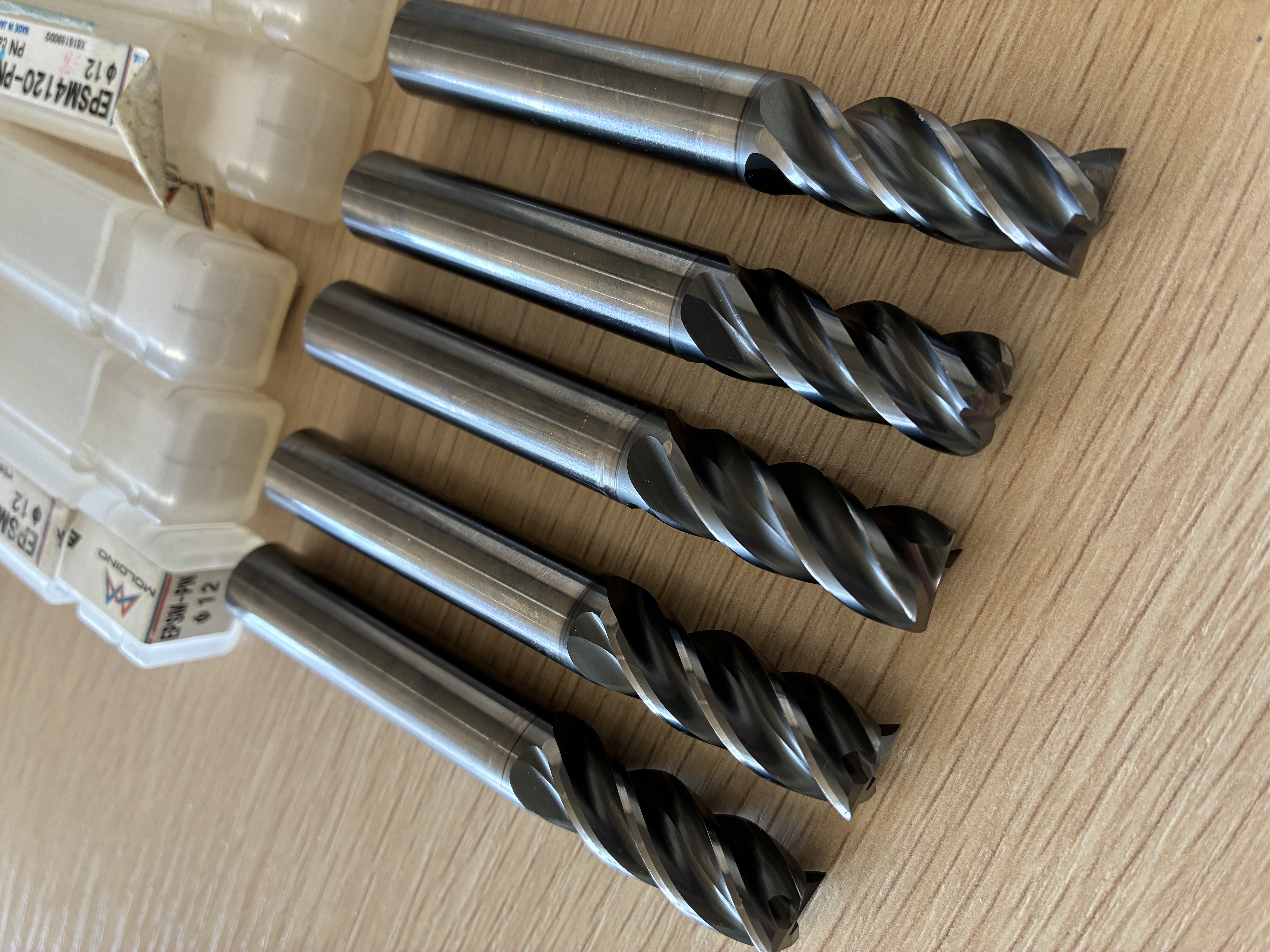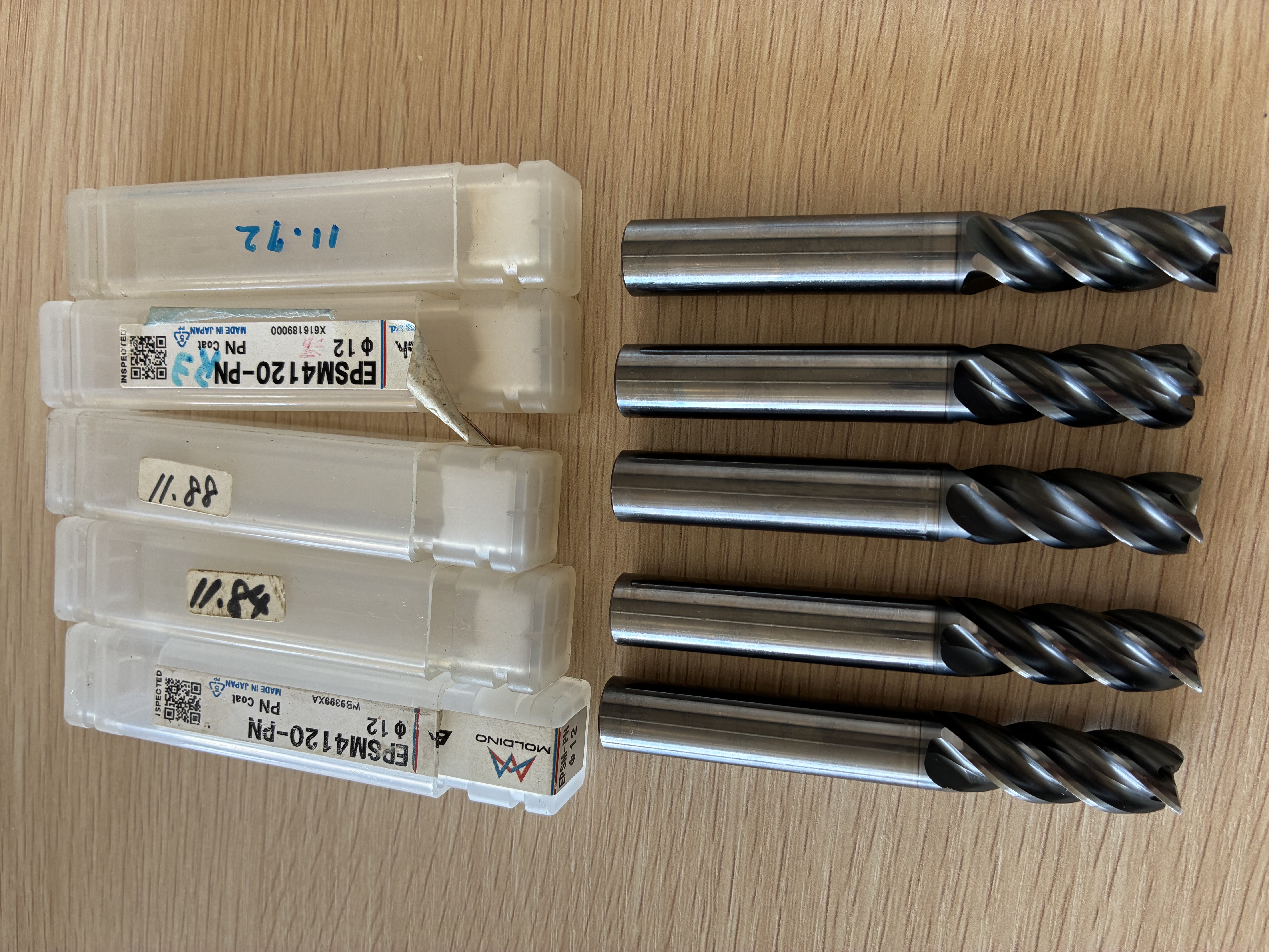 MOLDINO EPSM420-PNφ12超硬エンドミル 5本セットの再研済み品です。新品同様にご使用いただけますが、刃裏も再研しておりますのでφが小さくなってるものは、ケースに記載しております。1本は刃先をR3に再研してあります。