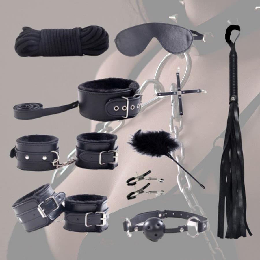 ★「豪華な10点セット内容」:手錠、シャックル、首輪、目隠し、鞭、プラグ、ロープ、くすぐり棒、クロスバックル、ニップルクリップ。PUレザー調ベルトを採用し、なめらかで柔軟性があります。また裏地にボアを採用し、装着時の思わぬケガを予防します。安全に楽しくSMプレイの雰囲気を高めることが出来るアイテムです。