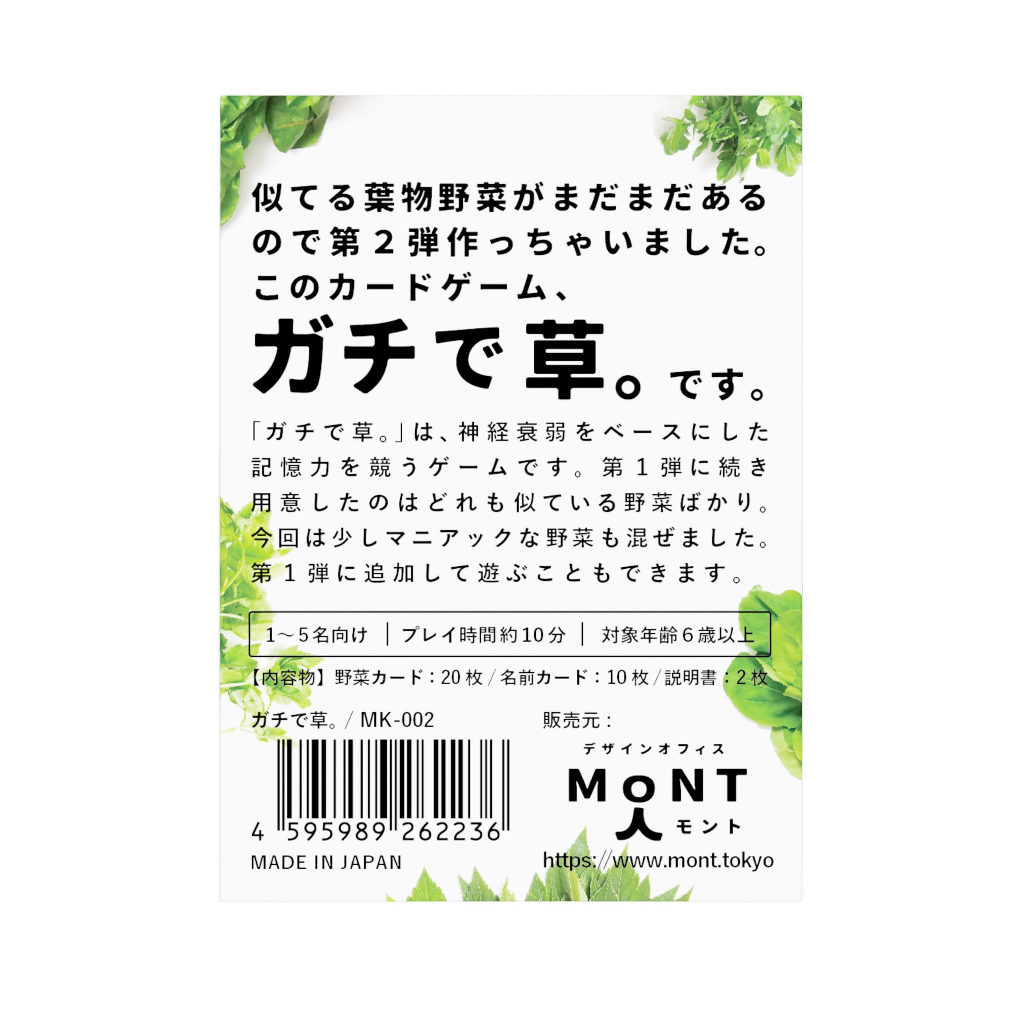 老若男女みんなで遊べる!葉物野菜の神経衰弱! 7分程度でサクッと終わる軽ゲー!重ゲー前のオープニングアクトに最適! 野菜カード:20枚/名前カード10枚/ルールカード2枚/合計32枚入り 丈夫な厚手の紙を使用。 1人から5人まで幅広い人数で遊べる!