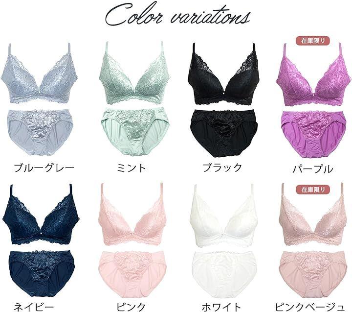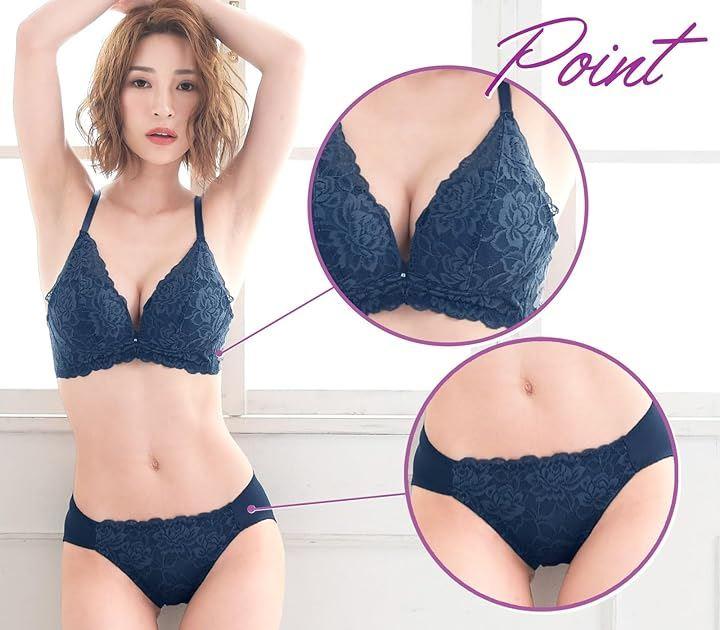 「特徴」脇高/パット有り 厚み約1cm/取り外し不可/ポケット無し/ストラップ調節可能・取り外し不可/ショーツ フルバック/ホック2x3段/レース生地 伸縮性あり/透け感あり/ノンワイヤー タイプ/サイドボーンあり