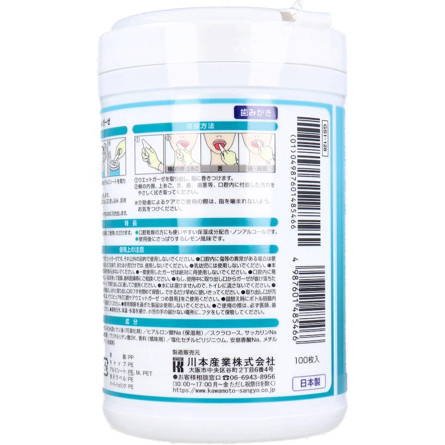 【使用方法】(1)ボトルのキャップを回して開け、内側のアルミシートを取り外します。(2)中央部のウエットガーゼを1枚引き出します。(3)ウエットガーゼをキャップの裏側から取り出し口に差し込み、反対側から引き出します。(4)キャップをしっかり閉めてからウエットガーゼをななめに引き出します。★清拭方法(1)ウエットガーゼを取り出し、指に巻きつけます。(2)頬の内側、上あご、舌、歯、歯茎等、口腔内に付着した汚れをやさしく拭き取ってください。※介助者によるケアでご使用の際は、指を噛まれないよう、お気をつけください。
